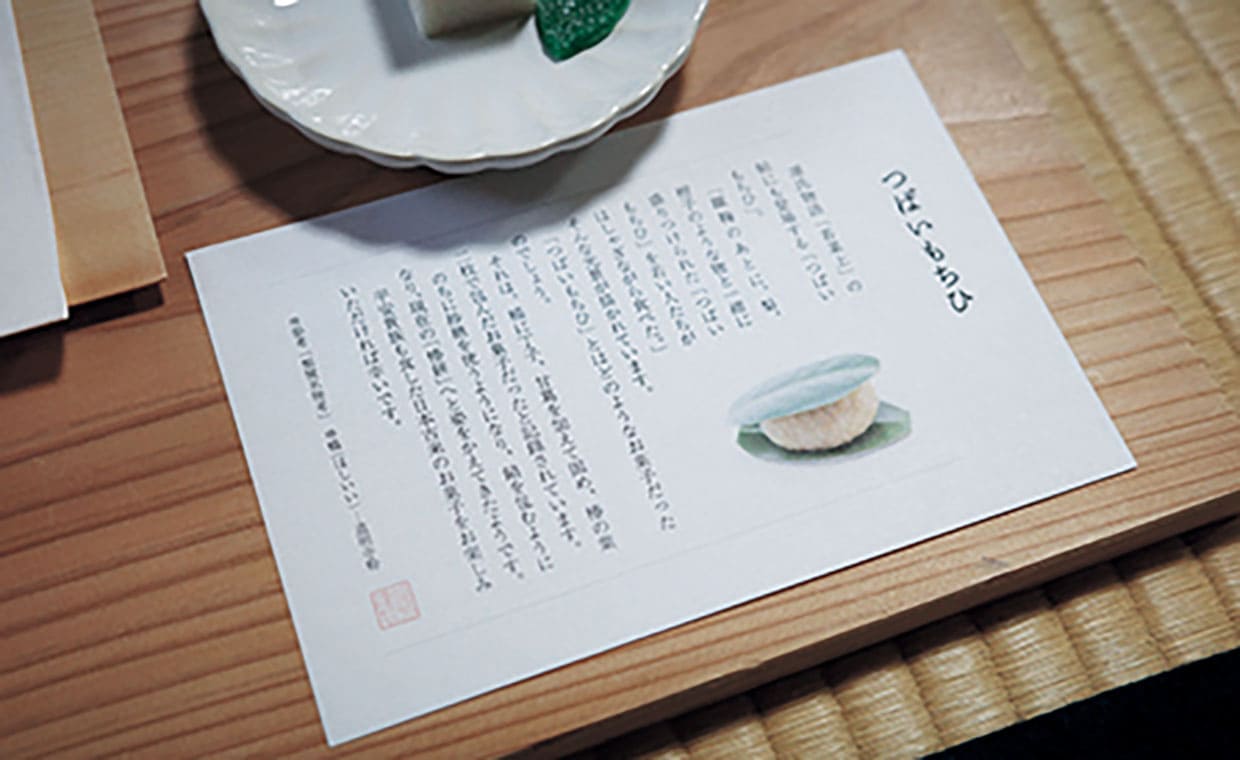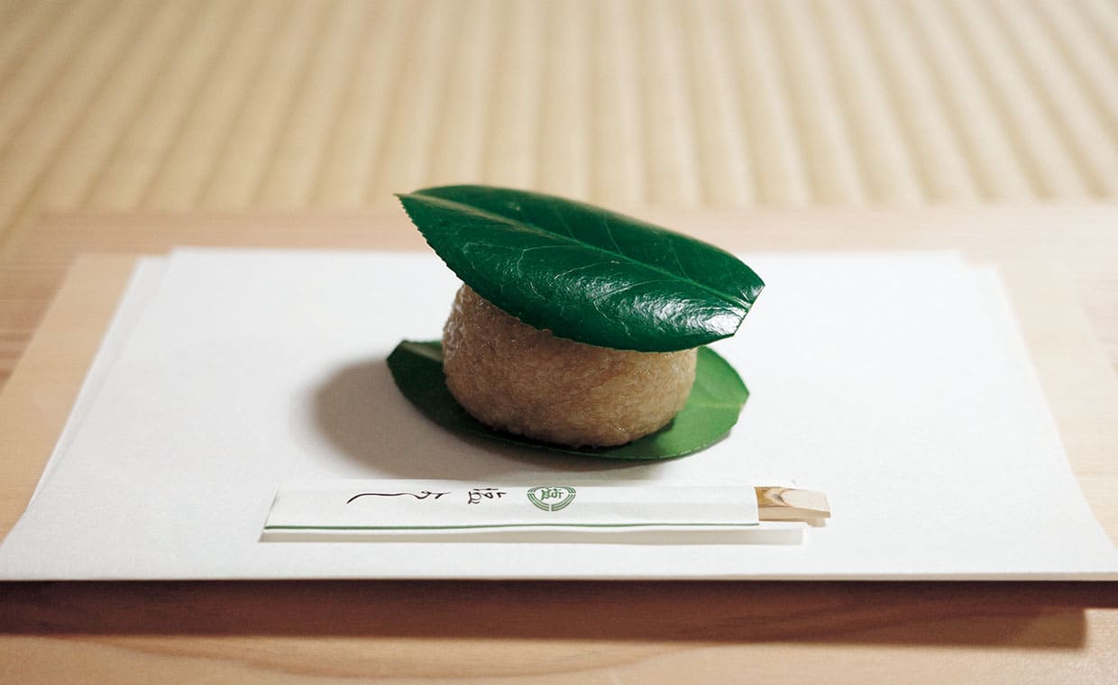 物語にちなみ「つばいもちひ」と命名された[御菓子司 塩芳軒(しおよしけん)]の椿餅は、道明寺に和三盆の糖蜜(和三盆糖を作る過程でできる)が用いられ、うっすら茶色。本来の椿餅が、餅に丁子(ちょうじ)や植物由来の甘味料である甘葛(あまづら)を加え固めた菓子だったことから、甘葛のイメージを持たせることはできないかと、糖蜜を合わせたのだという。もちもち、さらりとした道明寺が、中のこし餡とあいまって、ほんのりコクのある甘み。平安時代の椿餅に思いを馳せながらいただいた。