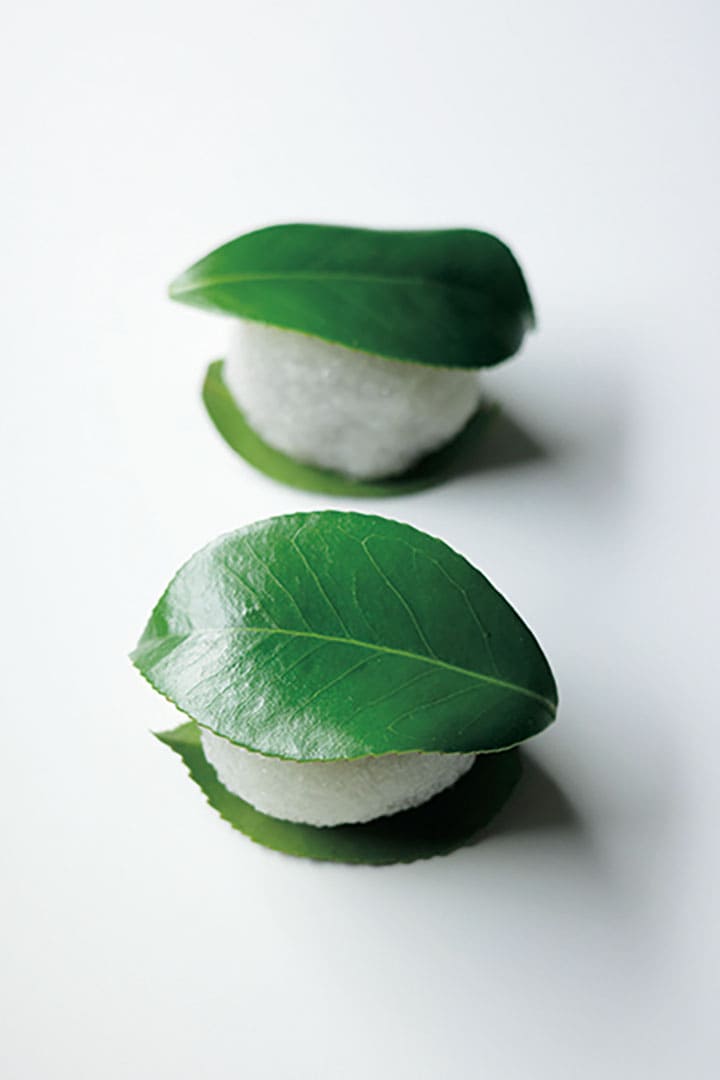 麩饅頭、桜餅や柏餅、柿の葉寿司、ちまきは甘いのもしょっぱいのも。葉でくるまれた食べものって愛おしい。プラスチックの食品包装が幅をきかすなか、いまどき自然の葉なんて。と純粋に感動してしまう。そんな私がひとめぼれしたのが椿餅だった。餡入りの丸い道明寺と、それを上下から挟む椿の葉の組み合わせ。とくにちょこんと上に乗った葉がもう、なに。雪うさぎ? ドロンと変身する狸? リーゼントヘアなの? 想像膨らむ、ゆるキャラ感がたまらないのだ。