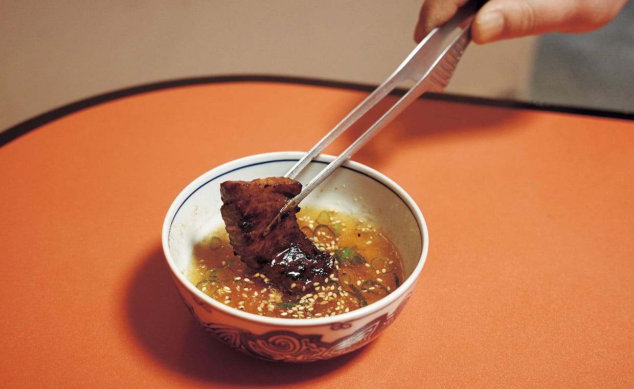 なぜ、なに、洗いダレ。というわけで、私が愛してやまない焼肉店、左京区の岡崎にある[牛(ぎゅう)おおた]に話を聞きに行った。ご主人の太田 聡さんいわく、洗いダレの発祥は祇園にある焼肉店の[天壇]で、レシピは店によってさまざま。牛骨スープがベースだったり、ポン酢を混ぜていたり。ちなみに[牛おおた]では、昆布とかつお節でとった出汁にみりん、酒、醤油、レモン汁などを加えているそう。「麺つゆみたいなもの」と太田さんから聞き、さっそく洗いダレを飲んでみたところ、うん、塩けと酸味が絶妙な、まさに麺つゆ。思わず「そうめんください」と懇願したくなる味だ。ごくごく飲めそう。と思ったら、実際にそのまま飲むお客さんもいるらしい。