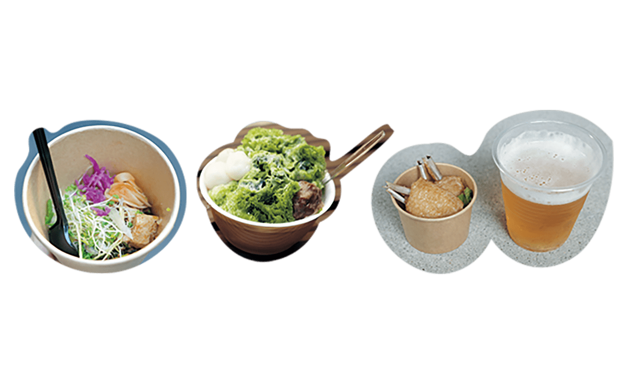 2023年の私的ベスト宵々山&宵山フード。左から、[INDIA GATE]のカップビリヤニ・鯛出汁チキン味。[亀屋良長]のかき氷。[YOLOs]で販売された、[食堂おがわ]の鶏からあげセット。