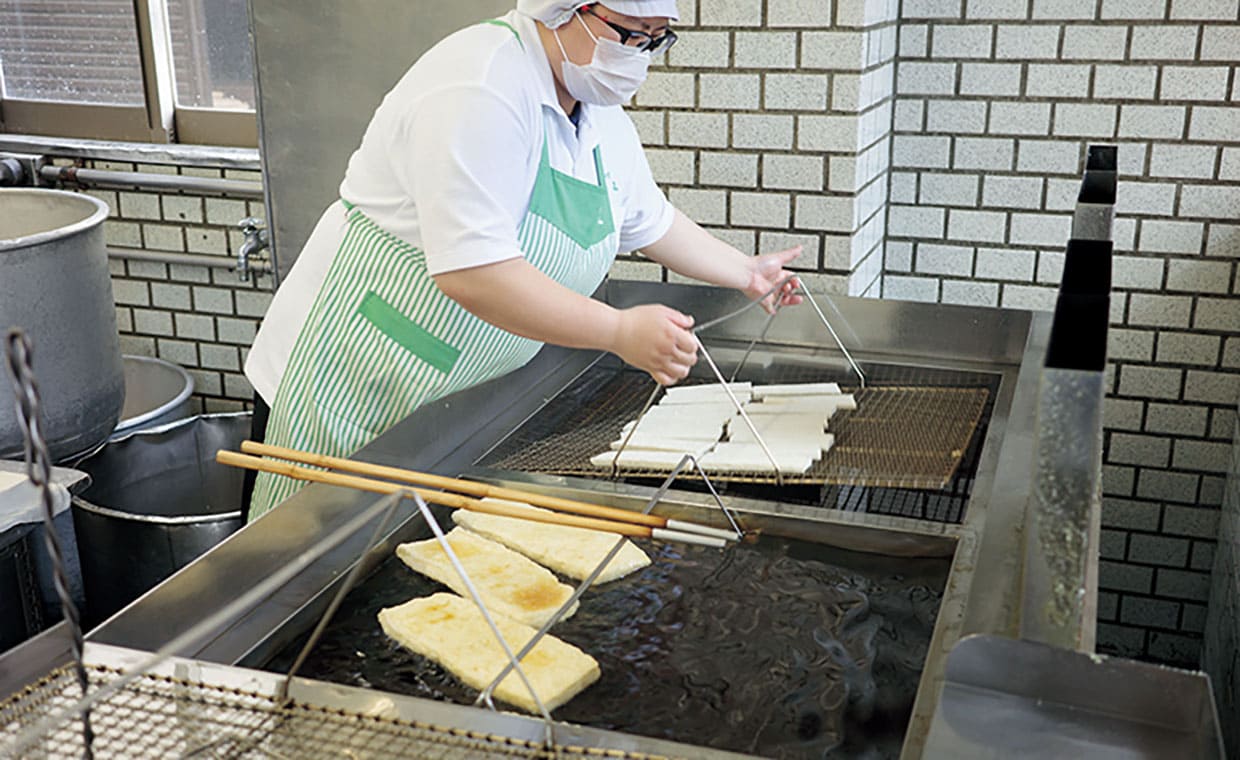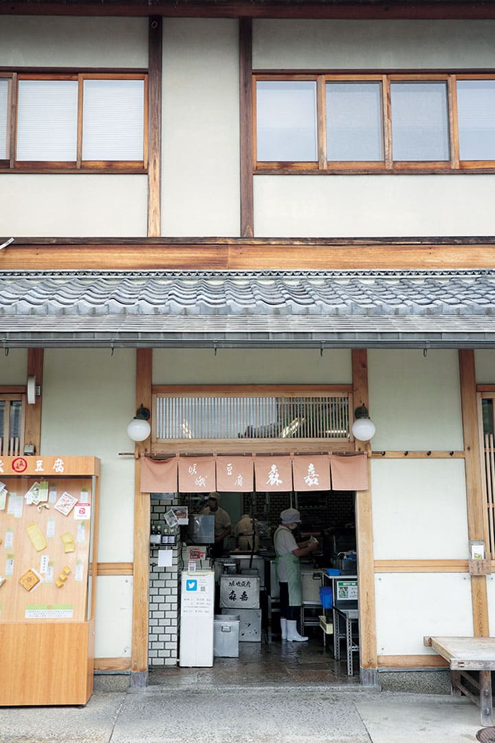 訪ねたのは、江戸後期創業の[嵯峨豆腐 森嘉]。六代目店主の森井邦夫さん曰く、四代目の祖父・進次さんが、やわらかな木綿豆腐の生みの親だという。第二次世界大戦中、戦地の中国で、にがりではなく、すまし粉(硫酸カルシウム)を凝固剤として使う豆腐づくりを目にした進次さん。日本に帰還後、にがりが手に入りづらくなっていたこともあり、すまし粉を用いた木綿豆腐を作るようになったそう。布を敷いた箱に豆腐をすくい入れ固める工程は変わらず。豆乳のたんぱく分だけを固めるにがりとは違って、すまし粉には「プリンみたいに」水分も一緒に固める作用があることから、ぷるぷるの木綿豆腐ができあがった。
