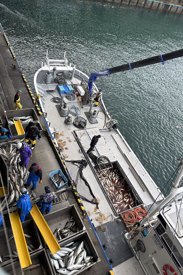 船全体には、鮭が敷き詰められており、活気にあふれた現場。