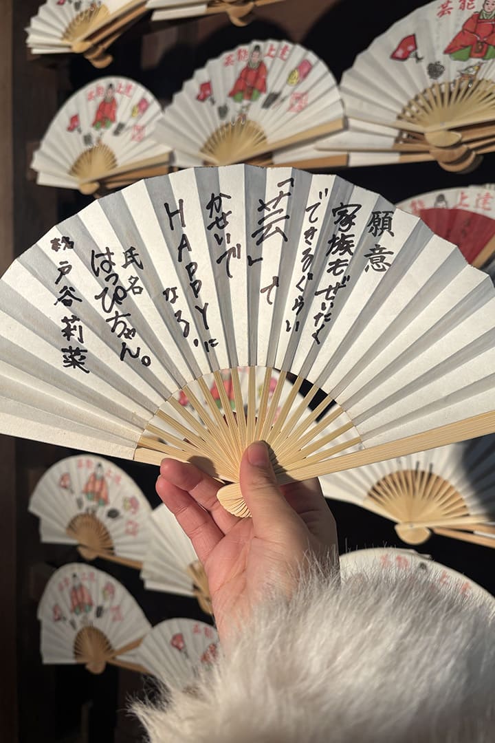 このような「縁起扇」という扇子の形をしたものがあったので、意気込みを書いて奉納。
