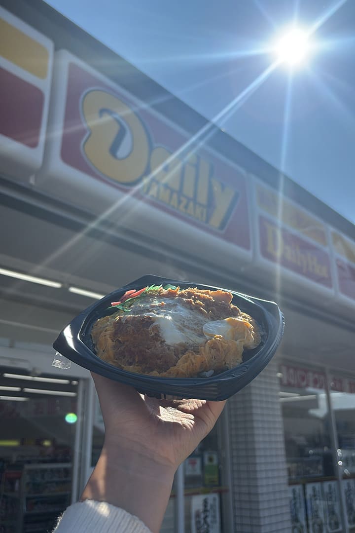 中継前にデイリーヤマザキの看板を見ながらロースカツ丼を食べていたら