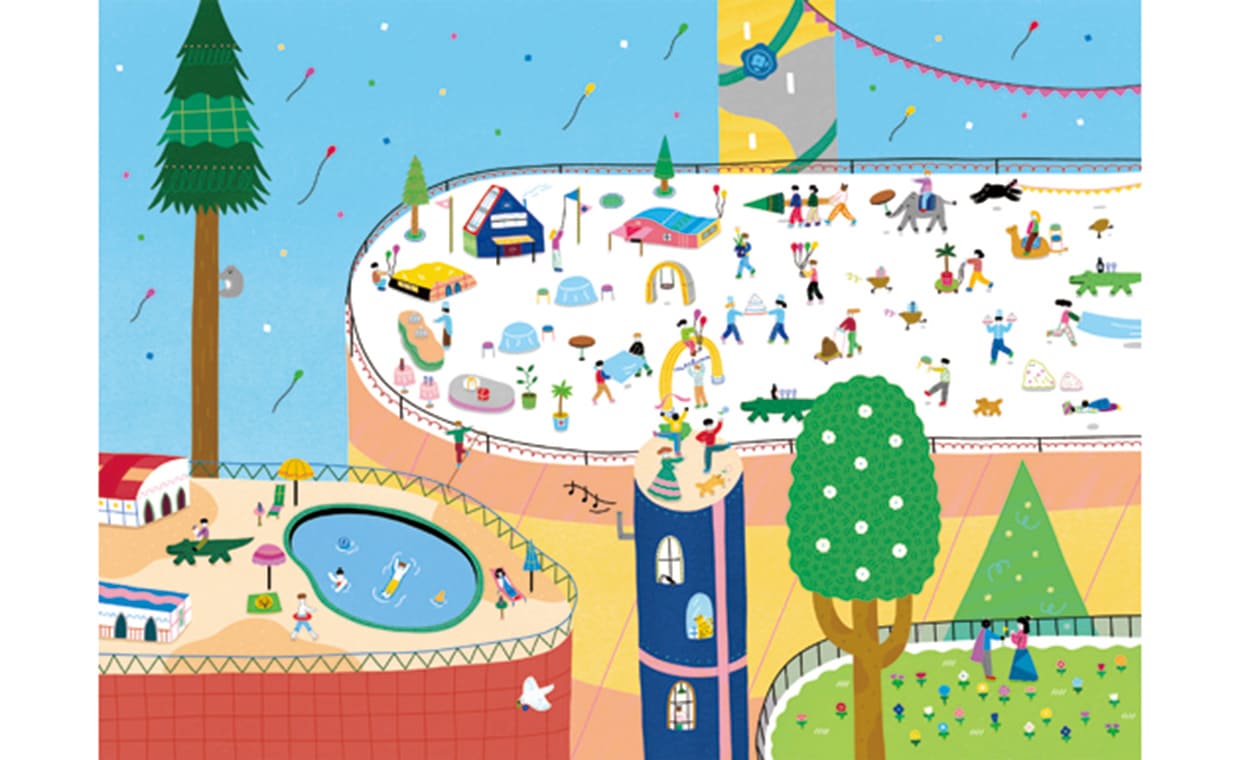 2019年からフリーのイラストレーターとして活躍する鈴木なるみさん。とりわけ特徴的なのは広い世界を俯瞰(ふかん)的に描いた作品だ。「学生時代に描いてたのはもっと人物にフォーカスして、ポーズとかも意識して描いてましたが、だんだん人が小さく群衆のようになっていって。私はひと目で全体を見たい、世界を把握したいという気持ちがどこかにあって、〝丘の上から街を見る〟みたいなことがすごく好きなんですね。そんな中で何かしてる人を観察したりするのも楽しくて」