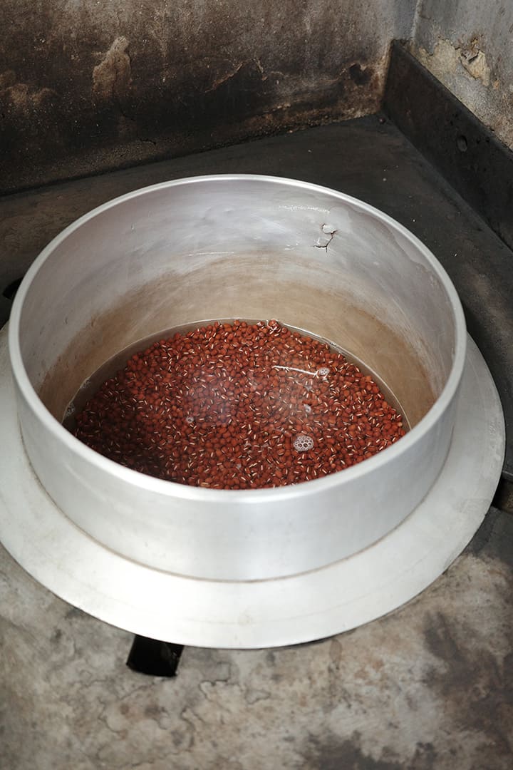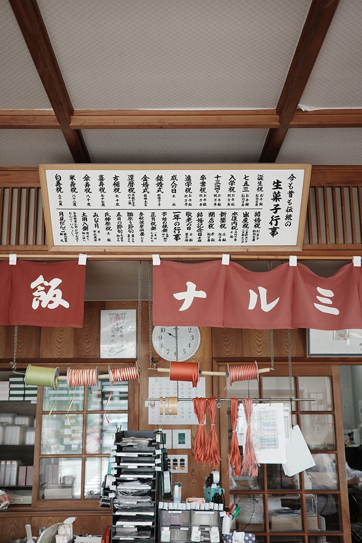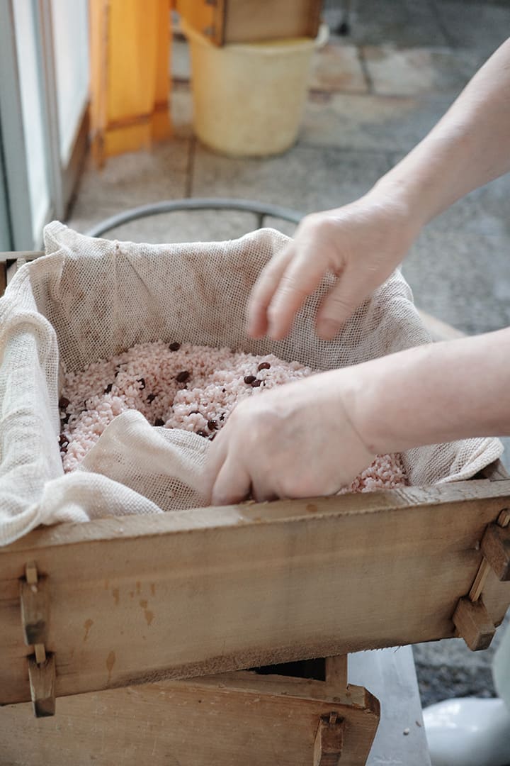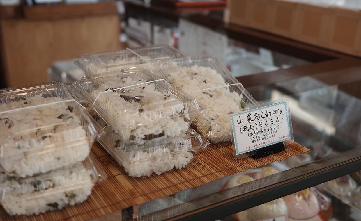 それにしてもなぜ和菓子店でお赤飯が売られているのか、気になるところ。[鳴海餅本店]も始まりはお餅屋さん。お供えものの白い小餅専門だったが、いつからか和菓子を手掛け、お赤飯も販売するようになった。もち米や小豆といった食材、蒸し器などの道具が共通していたから、との説が有力だけれど、町内のお祭りで「ついでにお赤飯も頼むわ~」との要望があり、応えるうちに商品化したのでは、というのが鳴海さんの推測。[鳴海餅本店]が店を構える西陣は、かつて機織りや染色の商いをしていた家が密集するエリア。当時はどこも商売で忙しく、お赤飯を家で炊く時間がなかった。「餅は餅屋じゃないけれど、専門的なものは店にまかせて購入する文化が、色濃く残っている地域なんです」。お赤飯が健在な理由は、そんな土地柄にもありそうだ。