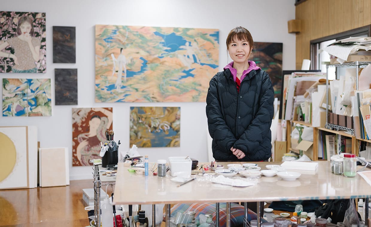 松平莉奈さん(まつだいらりな)日本画の画材や技法をベースに、史実や物語、歴史上の人物などを題材に制作。日本画を中心にした7人によるコレクティブ「景聴園」にも参加。12月には「景聴園」としての展覧会も京都で予定。