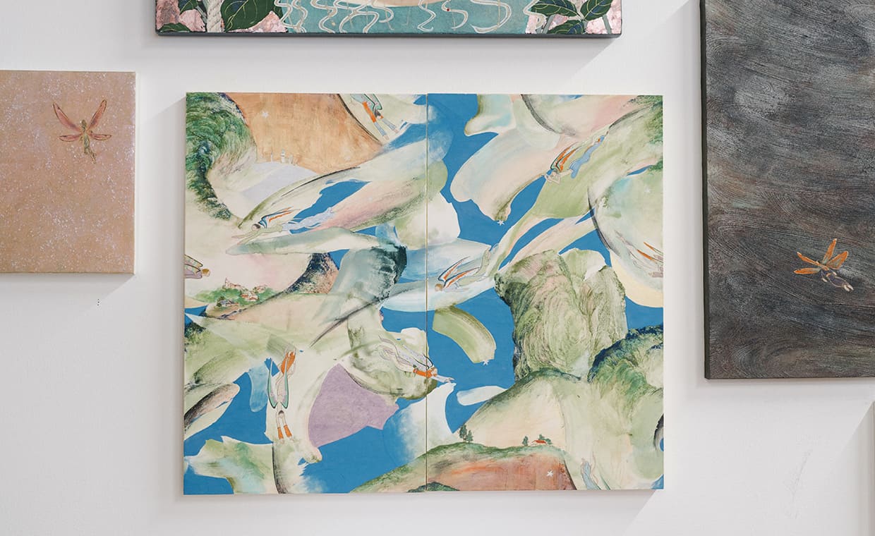 「山水画というのは、日々の雑事から離れて理想郷に遊ぶという要素があるんですが、そこで描かれている人物の出会いに私はグッとくるんです。山中で語り合ってる仙人たちって普段はそれぞれに過ごしているけど、その時間だけ場を共にしている、その瞬間が描かれていて、これが30代になった自分にも重なるところがあるなって、勝手に共感して(笑)。着物から着想した今回の作品は、どこでもない無限の空間を描いてるような感覚があって、それがこの数年、私が描いてきた出会いの場面にもうまくマッチするなというのも発見でした」