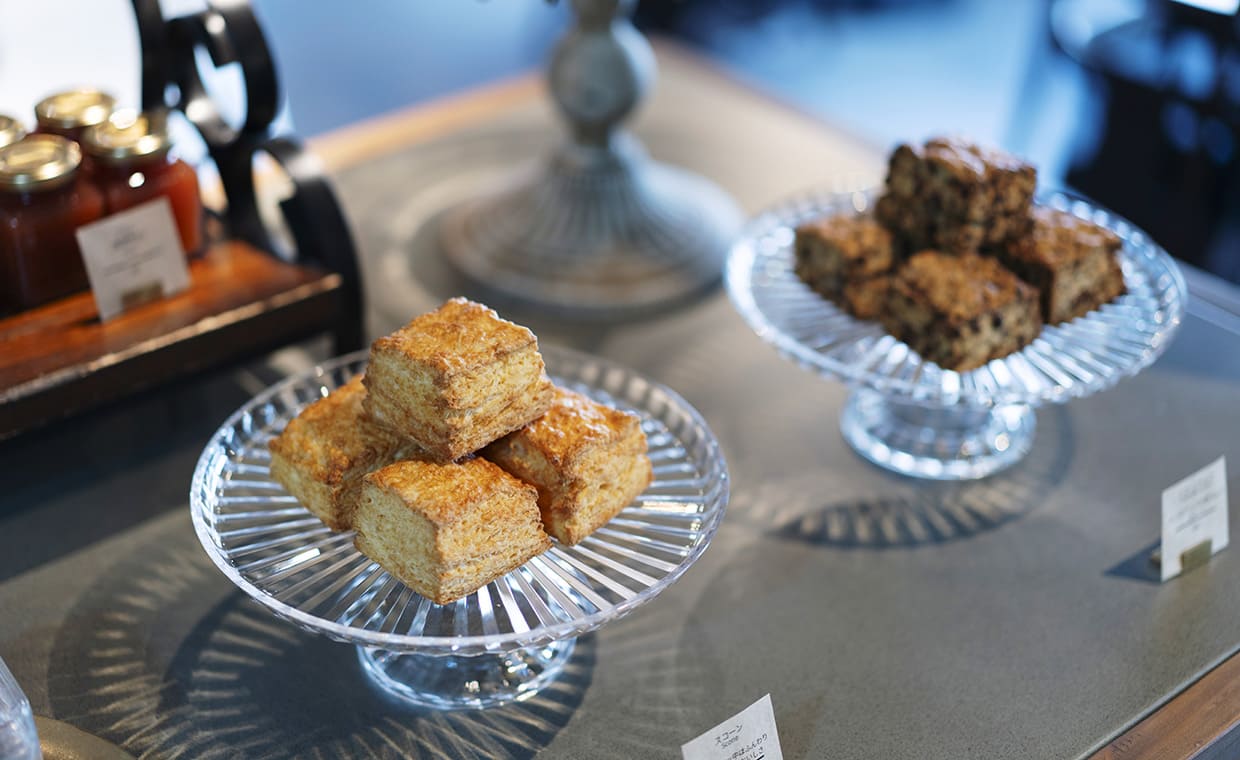 「日常の中に“小さな幸せ”をお届けできたら」と、甘さ控えめで、素材のおいしさを引き出すお菓子を手掛ける髙田千紗さん。昨年惜しまれつつ閉店した名店[なかたに亭]で経験を積み、[すず菓子店]の屋号で姫路市やたつの市を中心に、間借り営業やイベント出店などで活動。待望の実店舗はブルーグレーを基調とする落ち着いた雰囲気の店内で、きび砂糖や米粉など体に優しい素材を使用した生ケーキや焼き菓子がずらりと並ぶ。カフェスペースも併設し、天王寺[YARD Coffee & Craft Chocolate]のコーヒーや芦屋[Uf-fu]の紅茶などのドリンクと共に出来たての味わいをゆっくり楽しめる。