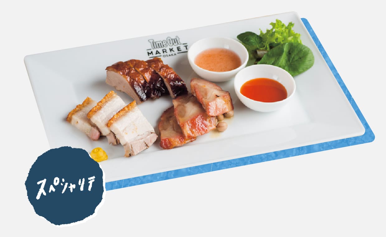 専用の焼き窯を駆使した広東・香港スタイルの焼味(シュウメイ)。右から、コク深いハニーチャーシュー、鴨子(ヤーツゥ)を一羽丸ごと焼いたローストダック、皮は香ばしく身はジューシーなクリスピーポークの3種を用意。2,200円