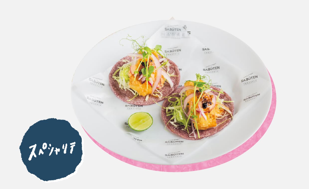 白身魚のフリットとワカモレのクリームサルサ、くん製唐辛子を用いたマヨネーズなどが、香ばしいトルティーヤの上で層をなす。その生地は、トウモロコシをゆでて、マサを作り、練った後に焼き上げるため、香りの立ち方も格別だ。1,400円