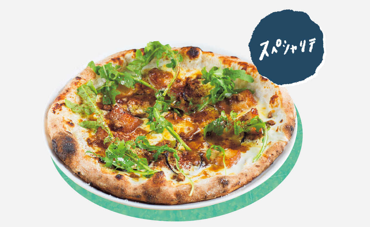 皮付きラフテーのジューシーなうま味に、粗刻み黒糖のガリッとした食感、さらに細く刻んだ黒糖をまぶし、澄んだ甘みがピザの上でクロスオーバーする。そこにナスとカカオという、ナポリの郷土の味を織り交ぜた一枚。3,080円。