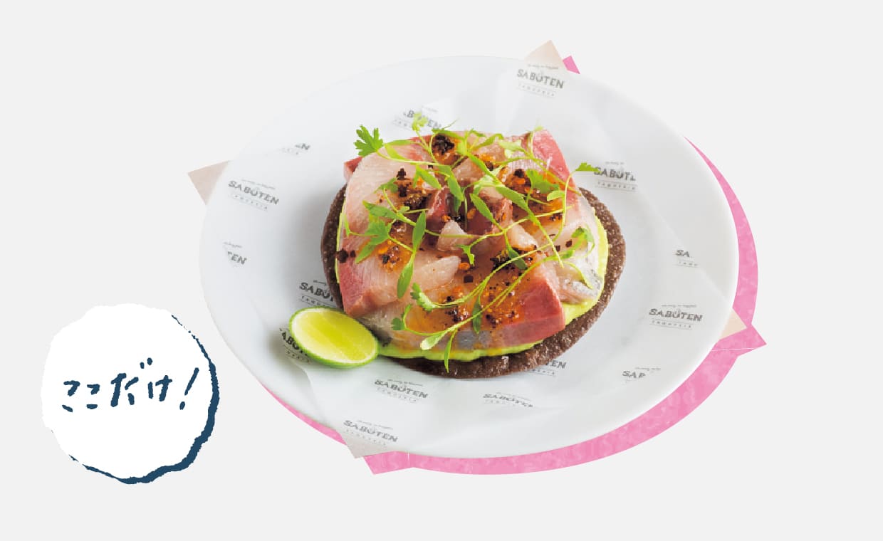 揚げトルティーヤ・トスターダの上に、分厚いブリの切り身をたっぷりと。アボカドのサルサのうま味、唐辛子・チルテピンの複雑味、ライムの酸味の余韻が心地よい。日本の食材とメキシコの文化が見事に融合している。1,500円