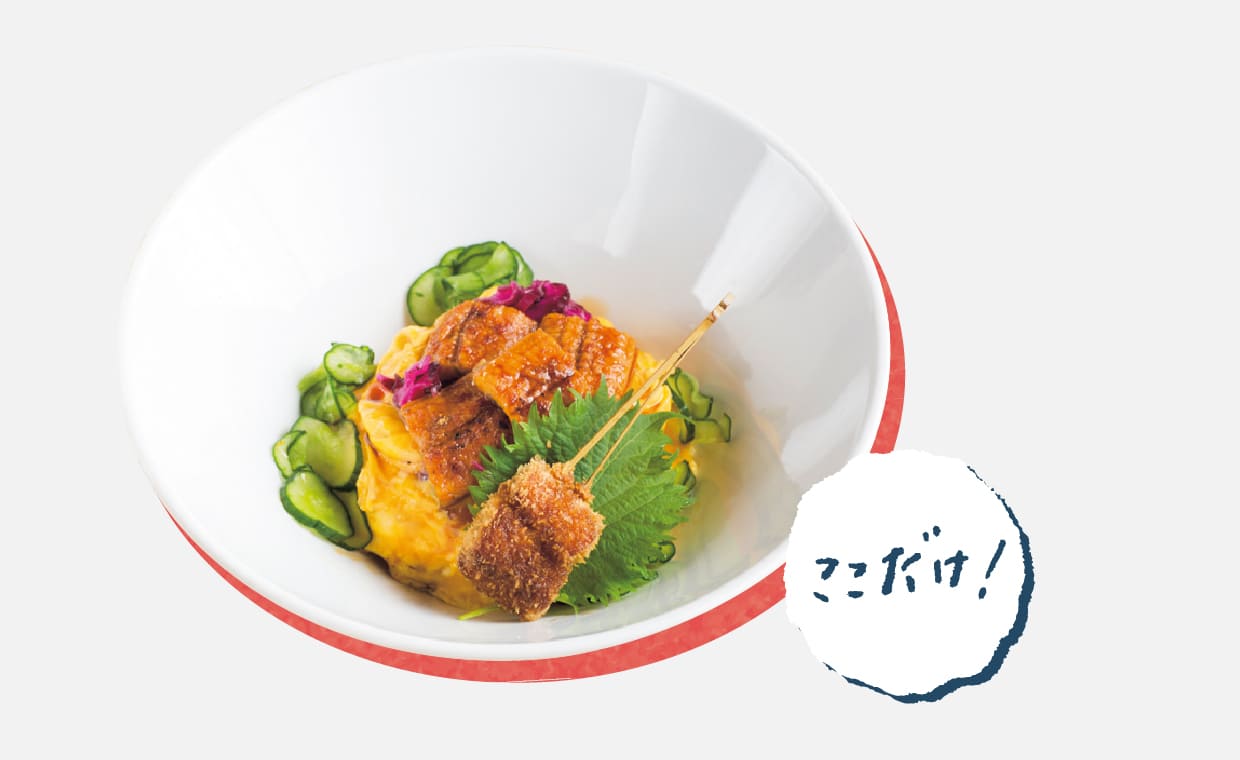 崎産のウナギは、ふっくら蒸したものと、串揚げにしたかば焼きの2種を使用する。オムライスには、ケチャップをベースにタイの甘辛いソースを少し利かせてアジア風のアクセントを。猛暑にぴったりのパワーフード! 3,500円