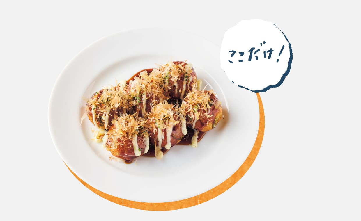 本店にはないメニューで、3種の味をそろえるたこ焼き。毎朝、キッチンで仕込む昆布とカツオだしをたっぷり用いて、じんわり広がるうま味を楽しませてくれる。写真のソース650円のほか、九条ネギ塩、めんたいマヨネーズもあり。
