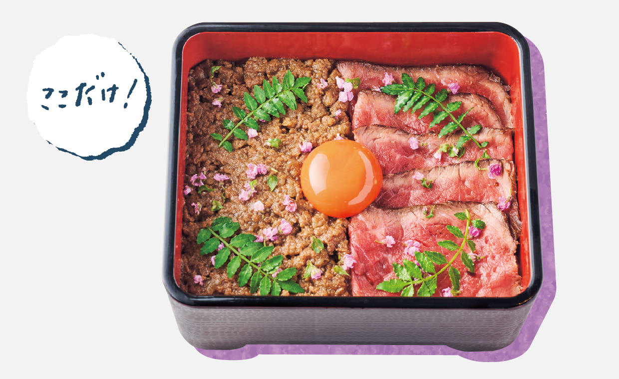 右にすき焼きの割下にくぐらせた和牛の赤身肉たたき、左に牛しぐれを敷き詰めた欲張り重。和牛の香りとうま味を引き立たせる米には、土佐天空の郷・にこまるを。龍の卵と一緒に和牛の本質を堪能して。2,400円