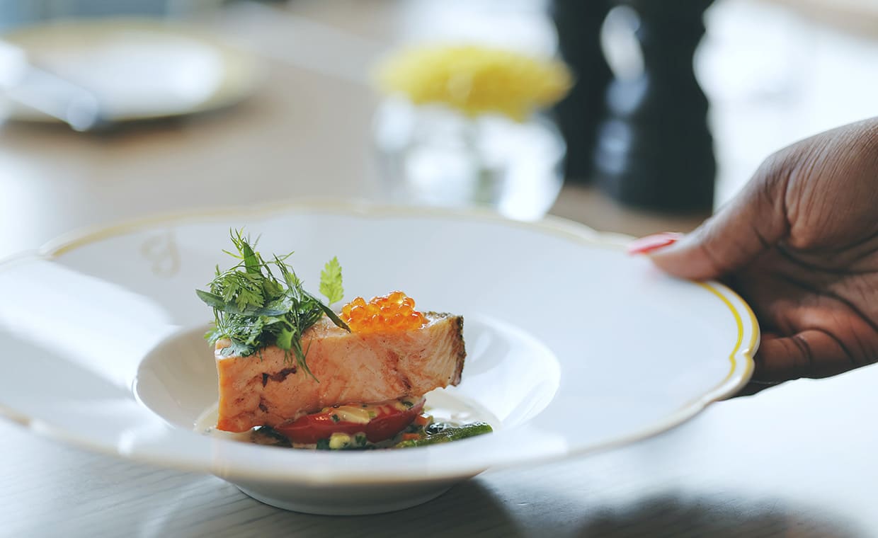 前菜、スープ、メイン、デザートから好きな料理を選べる4コースセットランチ6,900円より、ノルウェーサーモンのポワレ