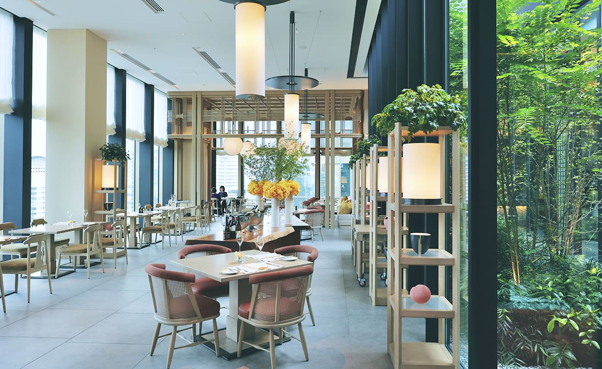 天然のオーク材、真ちゅうのペンダント照明器具など、温かみのある素材を基調とし、親しみやすさと優雅さを兼ねそろえたオールデイダイニング。モダンなアレンジを加えた伝統的なビストロ料理がいただける。気軽なコースセットランチや、セミビュッフェで多彩な料理が楽しめる週末限定のサンデーブランチも人気。