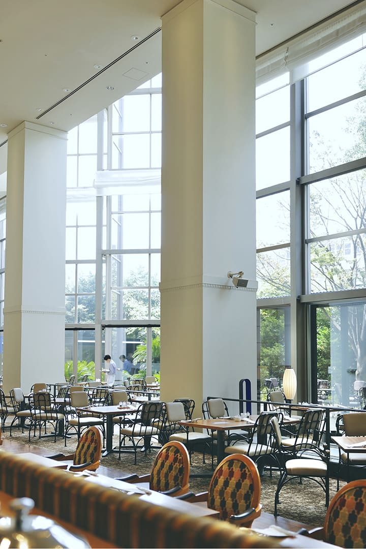 海辺から六甲山脈を望む六甲アイランド。駅直結という好立地で、1階の[ガーデンカフェ]は高さ8mもの吹き抜けと庭の緑が気持ちいい、自然を感じられる癒やしの空間に。