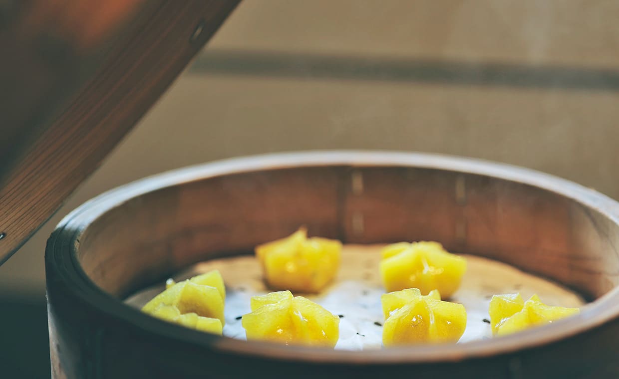 ビュッフェは2カ月ごとにメニューをチェンジ。特製の淡路島玉葱の牛すじカレーや、海鮮翡翠(ひすい)餃子(写真)など、兵庫五国から届く旬の食材を使った料理は、和洋中そろっておよそ50種類。11~12月には、北海道フェアを開催!