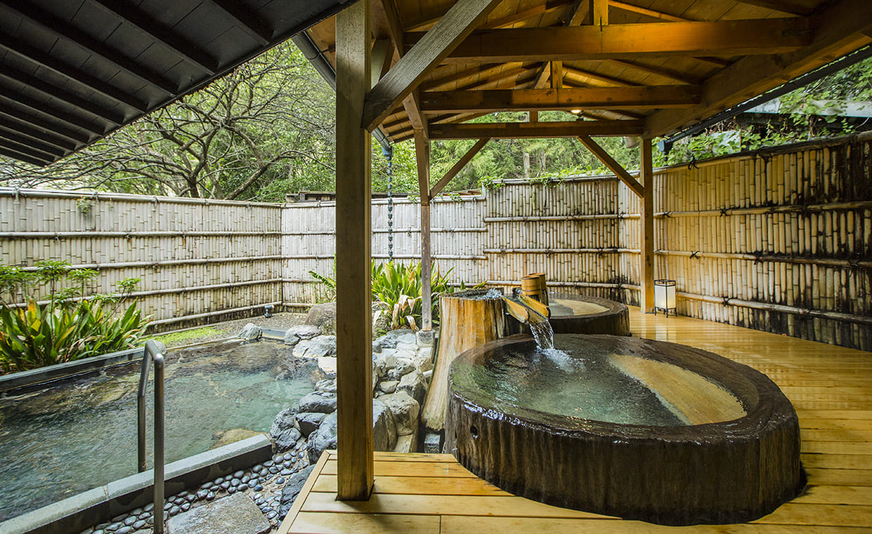 天然のラジウム温泉で“効き”がいいとされる湯の花温泉。石と木の素材を大胆に使った露天風呂も内湯も豪奢(ごうしゃ)な気分。追加料金で離れの貸切露天風呂も独占できる(45分3,300円、要予約)。