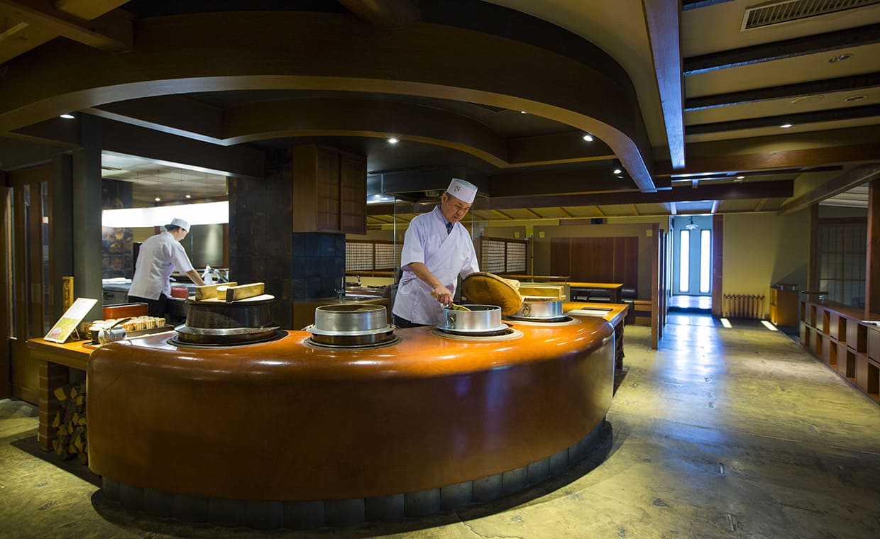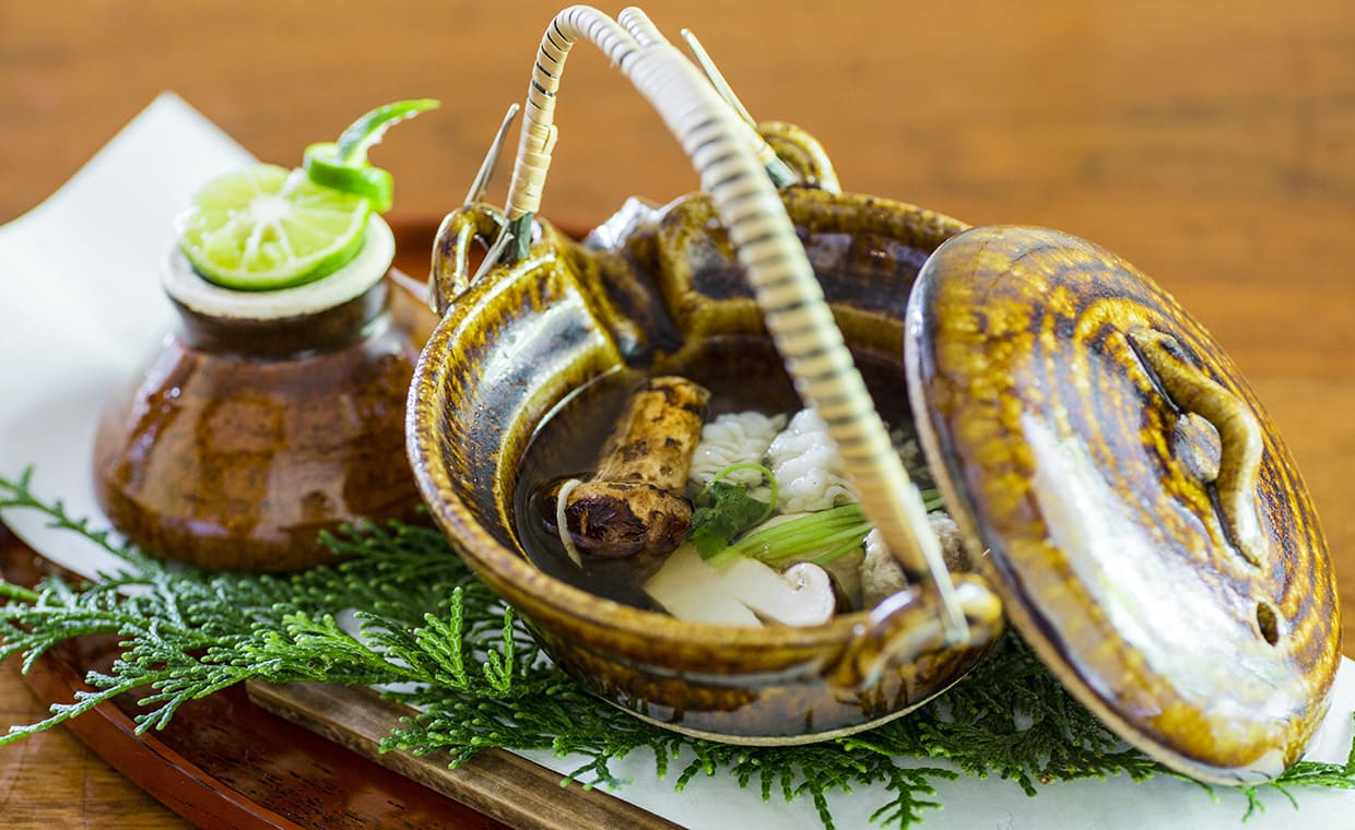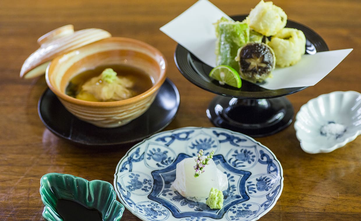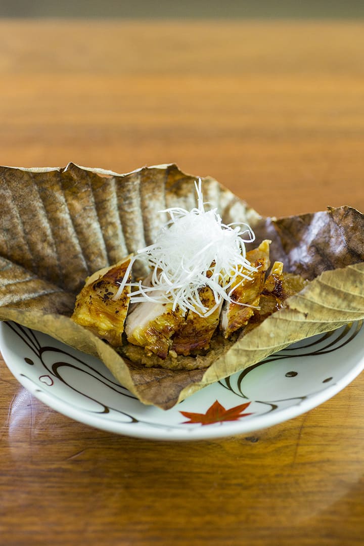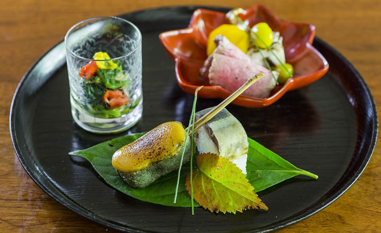 しっくい仕上げのおくどさんが鎮座するダイニングで、亀岡牛のローストビーフや丹波栗の甘露煮など旬を盛り合わせた八寸から始まる会席を。メインは、小鍋や亀岡牛ステーキなどから1品をその場でチョイス。取材時は丹波地鶏の朴葉味噌焼き。