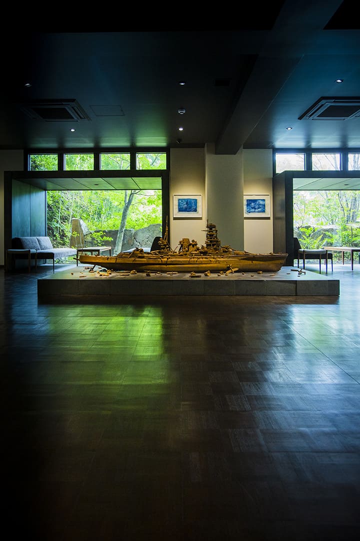 「湯の花温泉」の看板を初めて掲げた由緒ある旅館。桜の大木をくり抜いた湯船の露天風呂や、おくどさんのあるダイニングなど、旅情が高まる設えの一方で、2021年にリニューアルしたエントランスロビーには現代アートを配する。それもただ作品を展示するだけでなく、空間設計からアーティストに委ねる本格ぶりに、足を踏み入れた瞬間から非日常の感覚が呼び覚まされる。