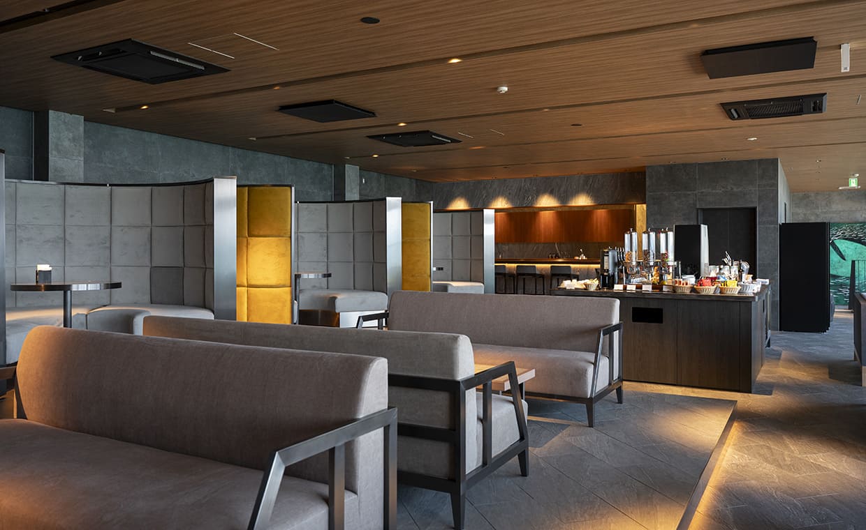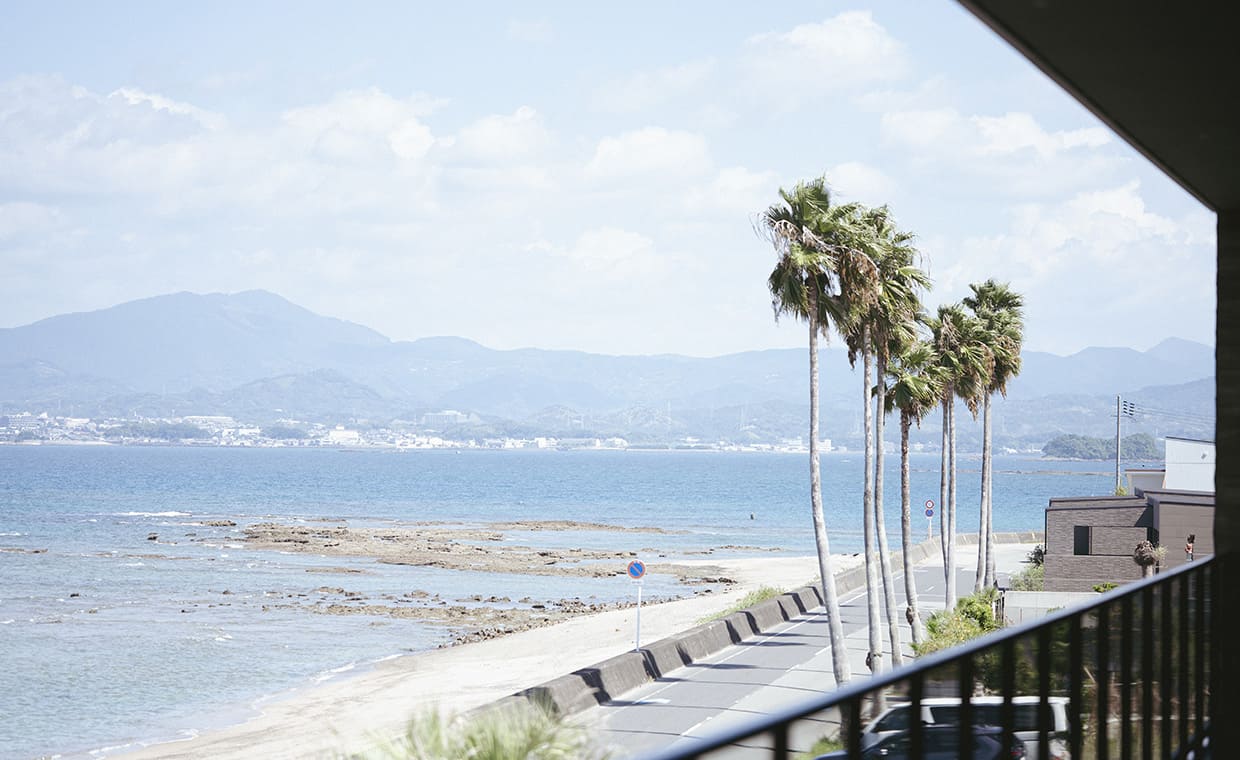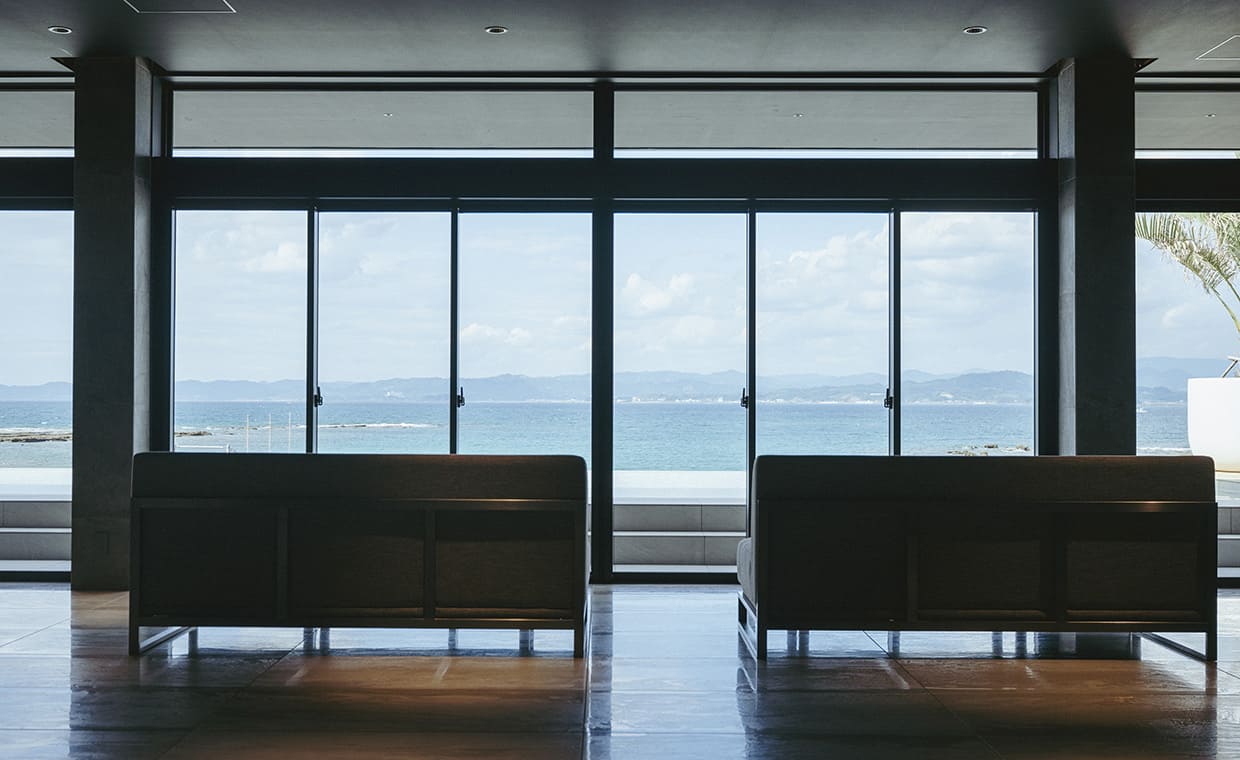 館内から望むのは、広大な太平洋と田辺湾の絶景。ロビーのテラスやバー、客室から心地よい潮風と非日常の景色を堪能できる。