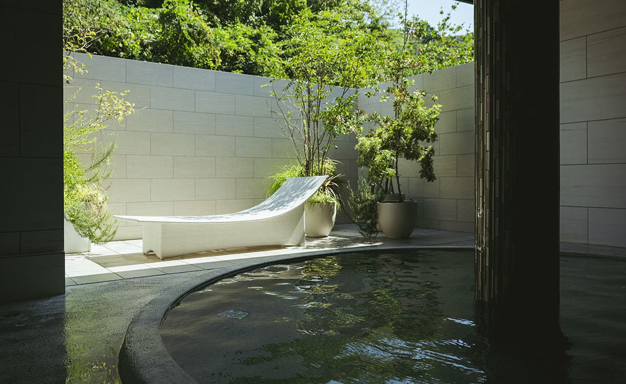 深層1000mの地下からくみ上げた純度100%の温泉水“純泉”を使用。程よい温度でじんわり温まり、湯冷めしにくいのが特徴。角質を軟らかくする作用もあり、美肌効果にも期待。