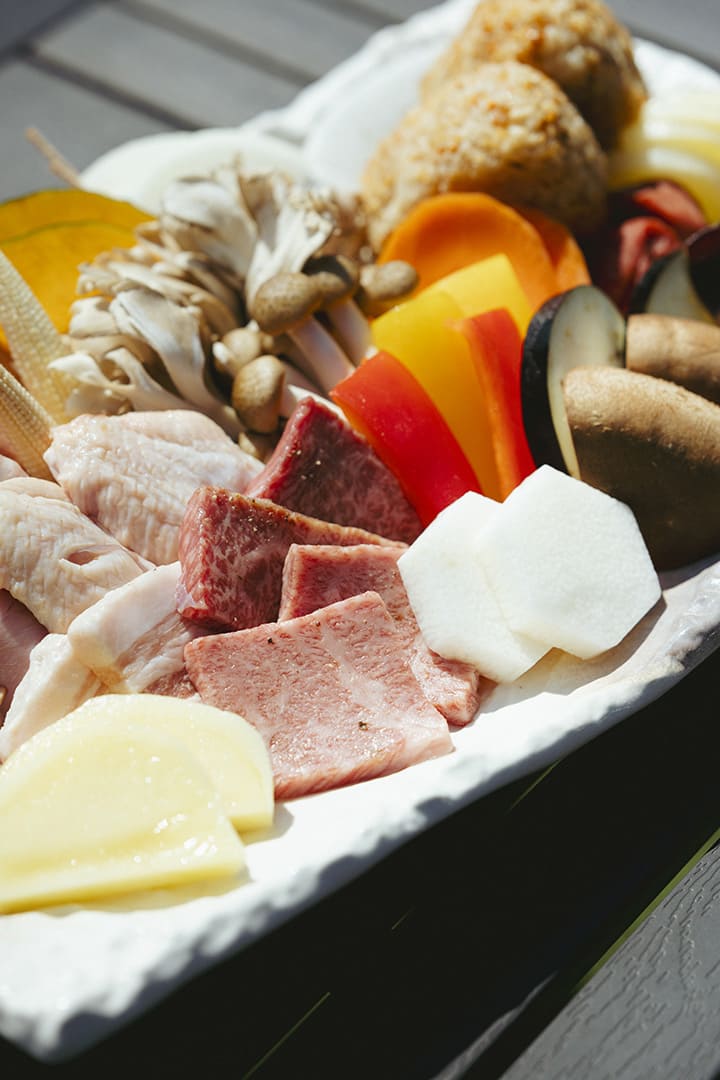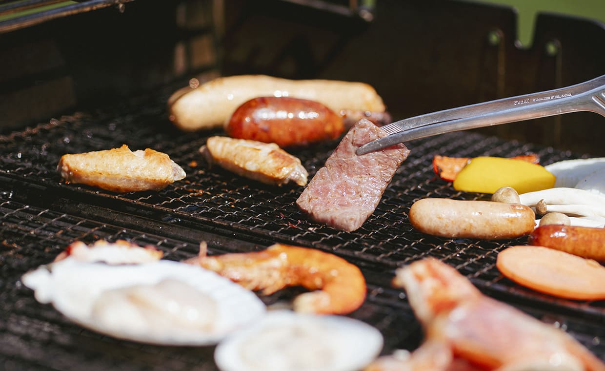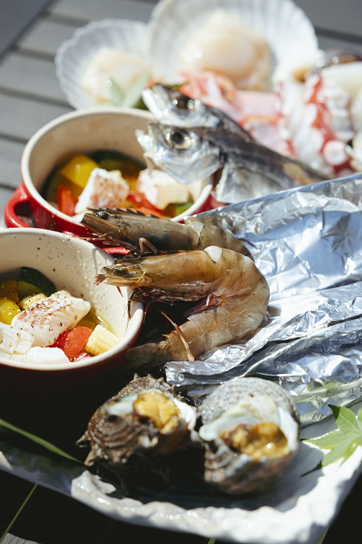昼食はガーデンでのバーベキュー。国内の数々の有名ホテルで和食料理長を務めた荒巻広喜料理長が、地産食材を厳選。取れたての鮮魚や熊野牛、魚介と野菜のアヒージョやホイル焼きなど、バラエティー豊かな品ぞろえがうれしい。