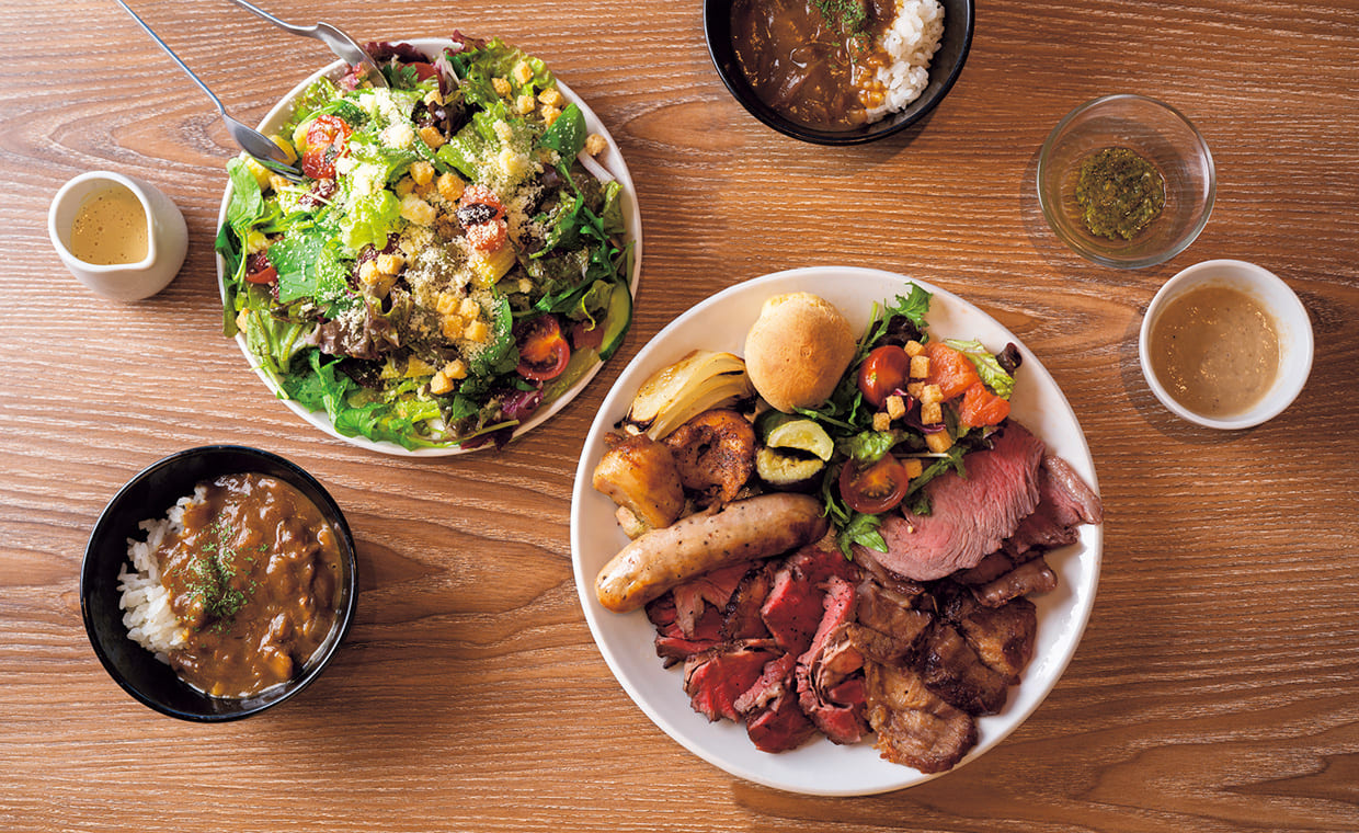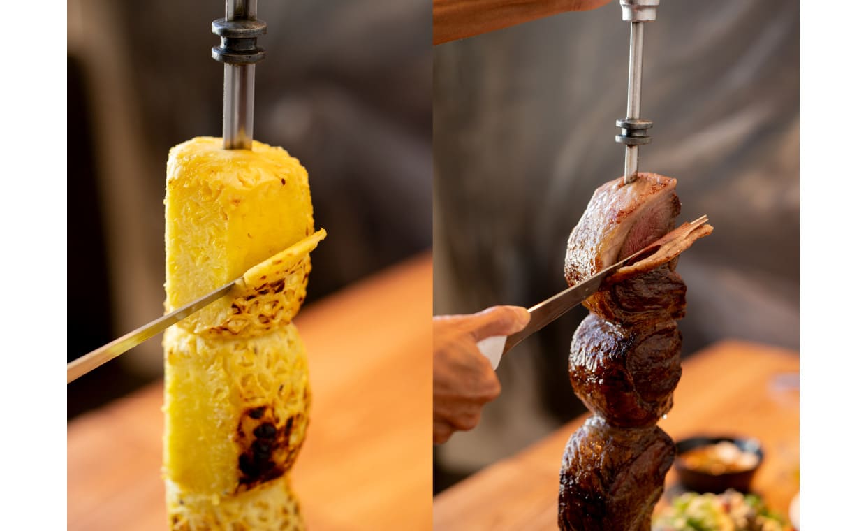 串に刺したブロック肉を専用マシンでジューシーに焼き上げて、ゲストの目の前で切り分けてサーブするブラジル発祥のシュラスコ専門店。希少部位のイチボにランプ、豚の肩ロースなどの肉に、ベイクドポテトや焼きパイナップルまで多彩な食材を味わえるディナーを用意する。さらに、ポンデケージョと呼ばれるチーズパンの食べ放題と、サラダ&特製煮込みカレー付き。好きなものを好きなだけ味わう、至福のひとときをぜひ。