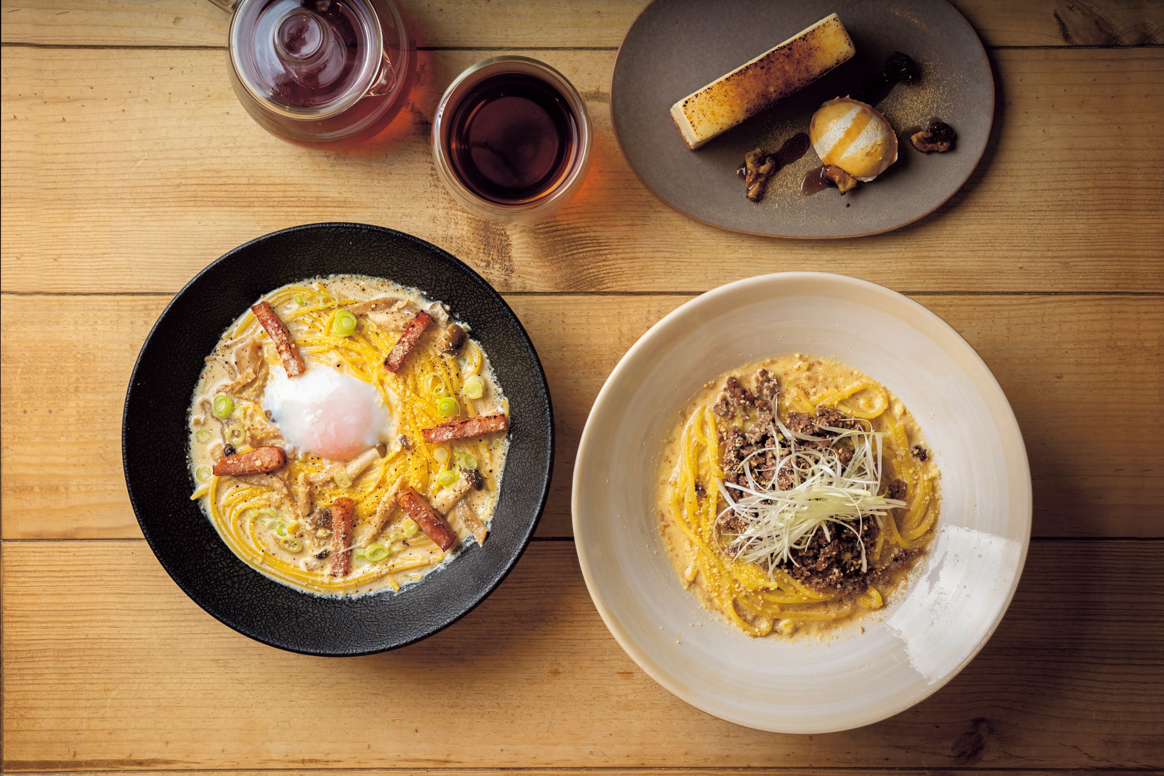 左から、こななの豆乳カルボナーラ1,570円、淡路産牛の白ごま豆乳ボロネーゼ1,720円。取材時は、西京味噌の焦がしレアチーズケーキとアッサム×ジンジャーの「ゆるり」をチョイス。