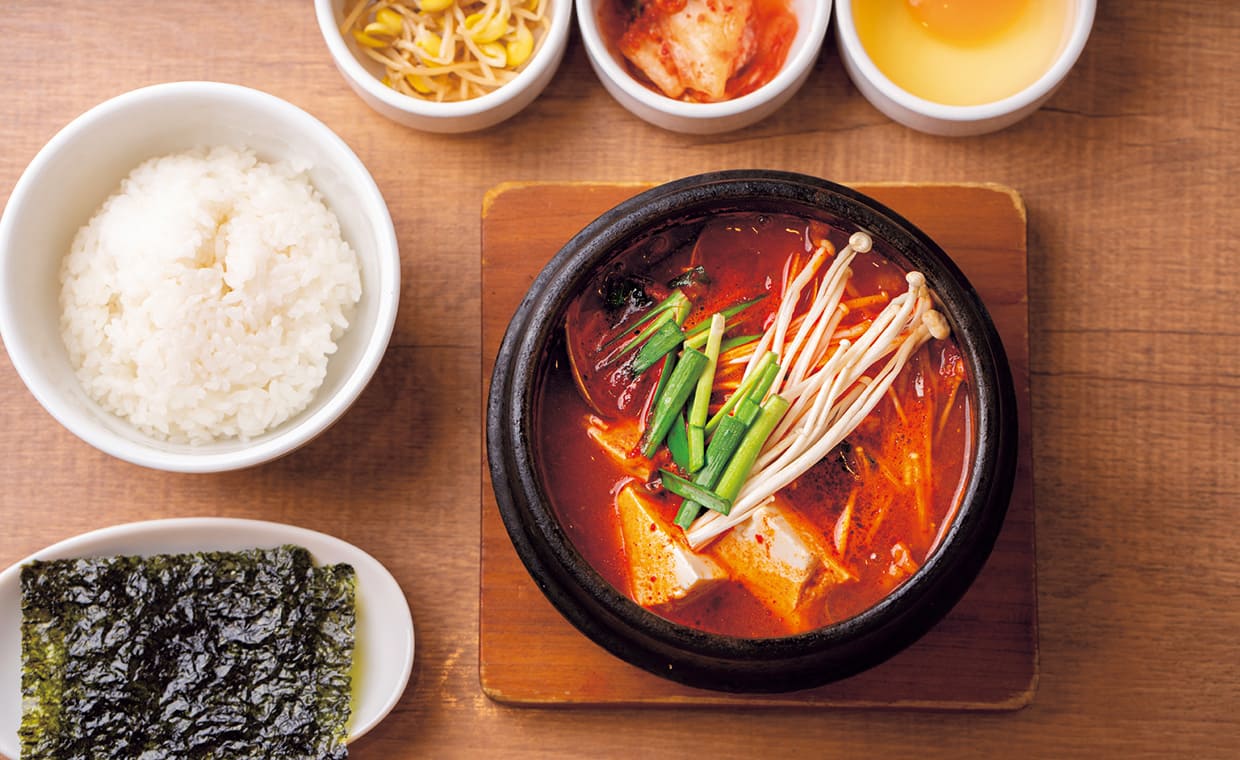 現地の家庭料理をベースに、日本人の味覚に合わせてアレンジした韓国料理専門店。滑らかな口当たりの豆腐を主役に、豚肉やタマネギ、ニラ、エノキなどの具材がどっさり入ったスンドゥブは、唐辛子の辛さと肉・野菜のうま味が絶妙に調和し、心も体も温まる逸品。ぴりっと刺激のあるスープは一度食べるとやみつきになり、ご飯がどんどん進む。生卵をプラスすると、まろやかな味わいに。土鍋で提供されるため、あつあつの状態のまま楽しめるのもうれしい。