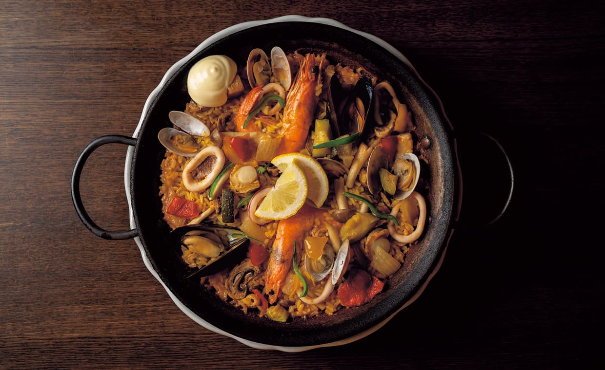 スペインを中心に、地中海諸国の調理法を取り入れた料理が楽しめる一軒。スペイン料理の代表格であるパエリアは、エビ、ムール貝、ホタテをはじめとした海の幸に、鶏肉、豚肉、キノコといった山の幸を組み合わせたぜいたくな味わい。エビなどの素材のだしがぎゅっと凝縮されたご飯は、爽やかな白ワインと好相性。具材がたっぷり入った華やかなルックスにも心が躍る。レモンやアイオリソースで味変しつつ、最後の一口まで堪能したい。