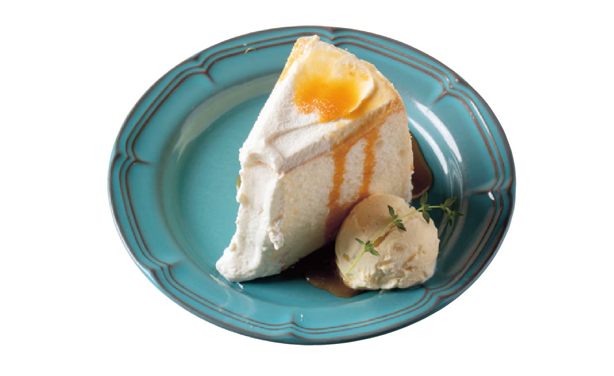 上から、ベジプレート1,749円〜、エンゼルフードキャラメルケーキ759円。食事と一緒に注文すると、ケーキが110円引きに。