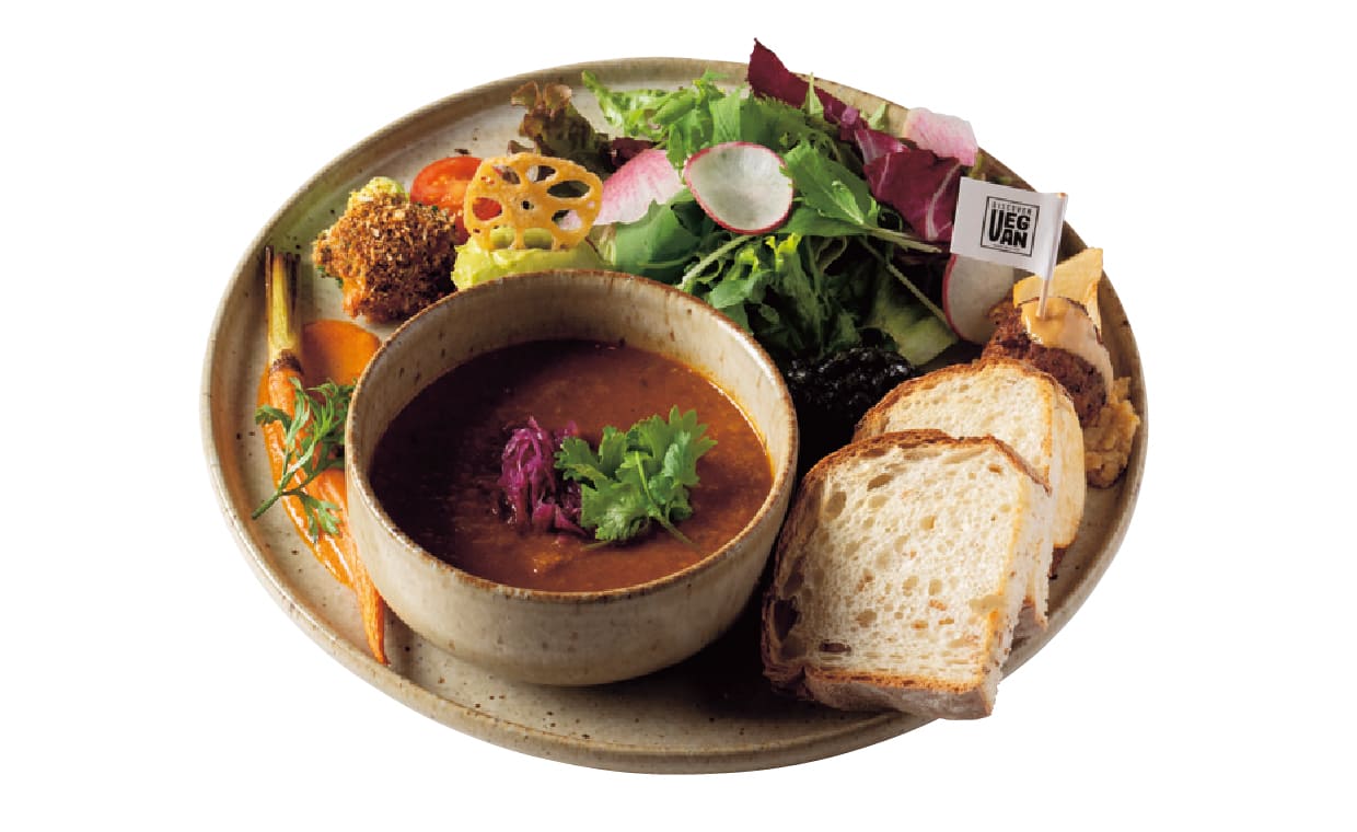 近郊農園から仕入れる新鮮な食材を使用。大豆ミートのタコスやレンズ豆とひよこ豆のスパイスカレーなど、ビーガン仕様の料理を含む4種類から選べるメインに、動物性食品不使用のデリ8種類が付くベジプレートは、ミント神戸店限定メニュー。食後には、ほろ苦いキャラメルソースがアクセントになった軽くてふわふわのケーキをぜひ。