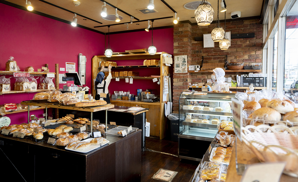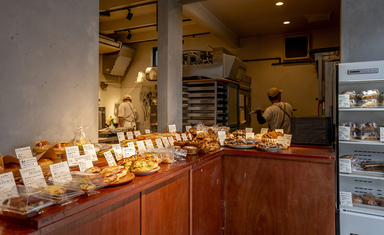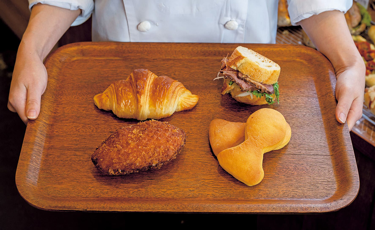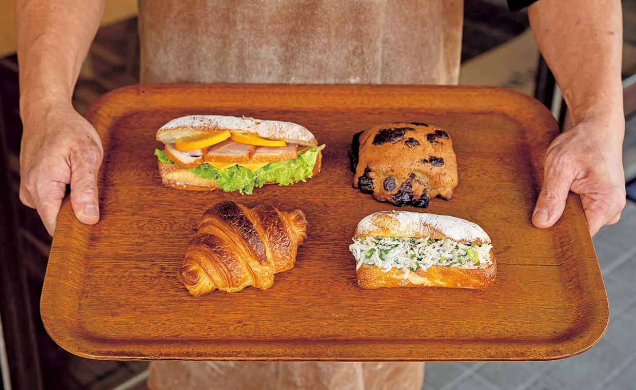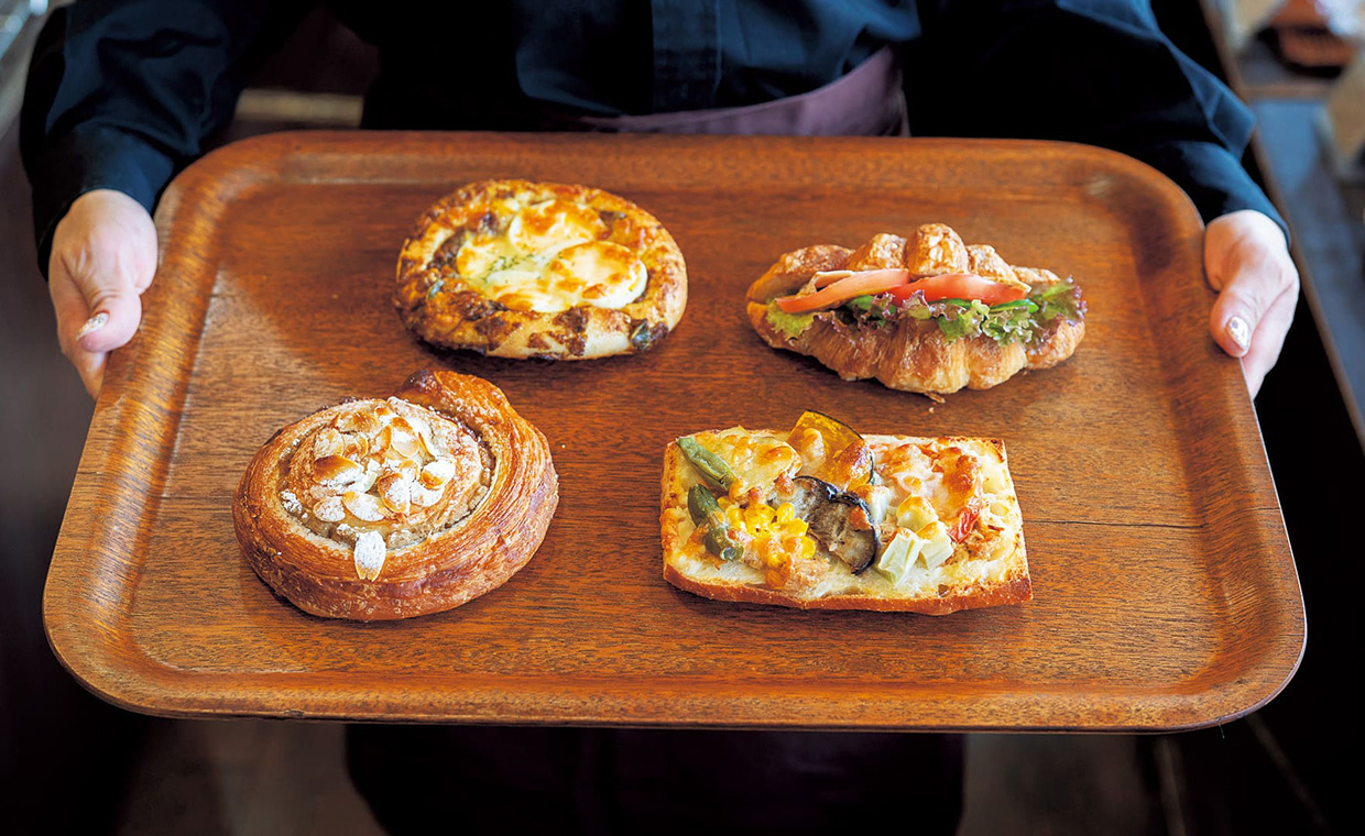 北摂を中心に10店舗を展開するベーカリーは、各店舗にそれぞれ特徴があり、「高槻岡本店は、広い今城塚古墳公園が目の前というロケーションが特徴」と店長の十文字良介さん。店内にもゆとりがあり、カフェやテラスでイートインもよし、テイクアウトして公園で食べるもよし。100種類以上並ぶパンは、クロワッサンやカレーパンなどの定番に加え、毎月6種類以上、スタッフ一人一人のアイデアから生まれる新作を出し、飽きさせない。