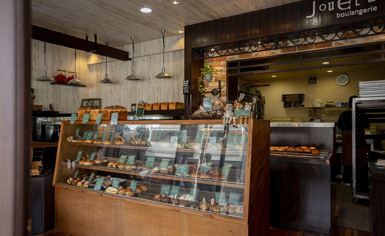 店名の「ジュエ ボワット」とはフランス語で“おもちゃ箱”の意味で、「楽しいものが詰まっていて、じっくりと見て選んでもらえる店でありたい」とオーナーシェフの高山茂成さん。その思いは旧城下町の閑静なロケーションにある店でしっかり伝わり、料理を食べるのも作るのも好きというシェフが、自分が実際に口にしておいしかった素材を組み合わせる。鴨とオレンジ、シラスとオリーブオイルなど、ワインも欲しくなるわくわくするパンがいっぱい!