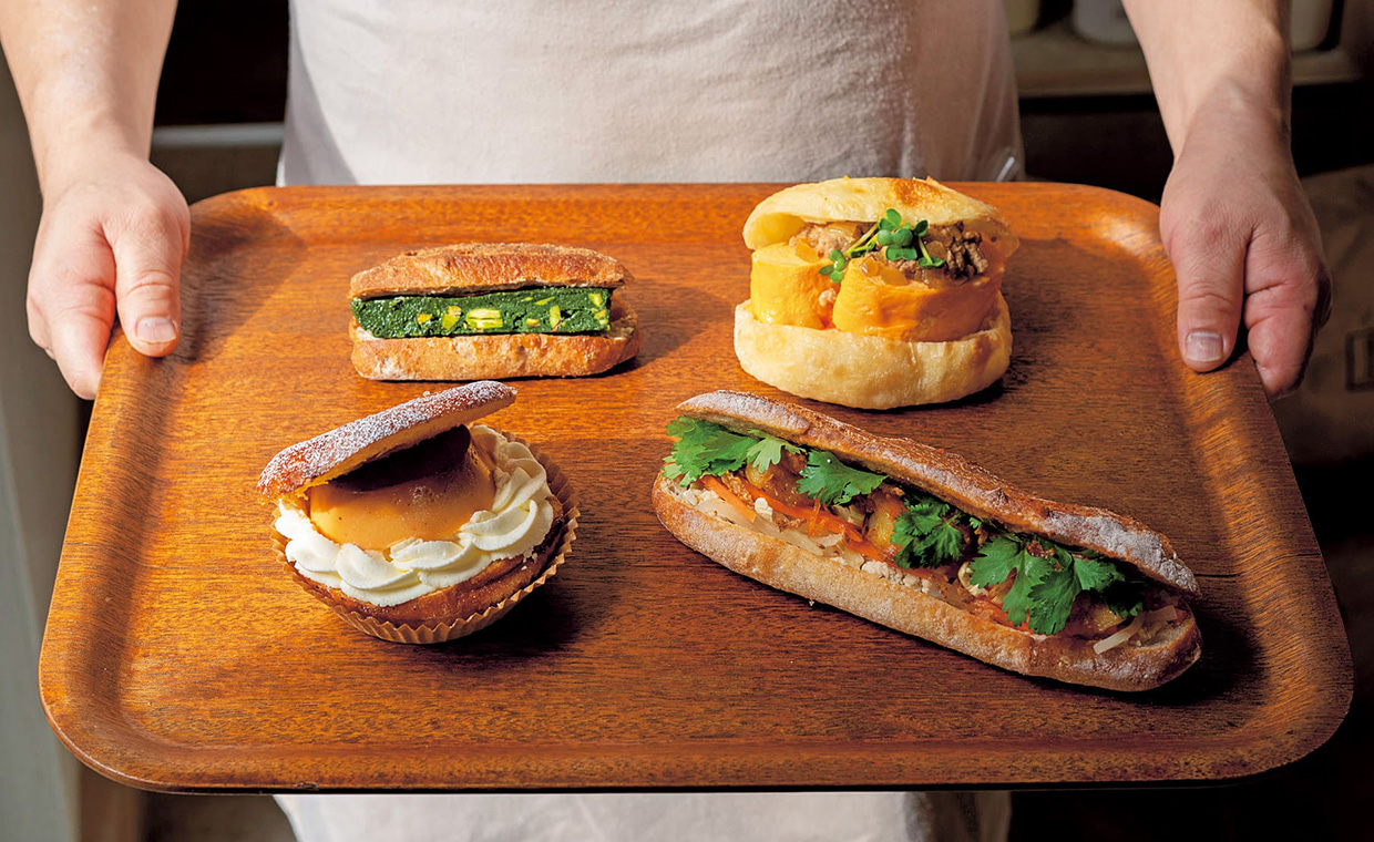 高槻で生まれ、梅田に移転しても大人気だった[ROUTE271]。オーナーシェフの船井高志さんは2023年、店名も新たに[丹青]を現在の地にオープン。有名レストラン、パティスリーでも経験を積んだ船井さんの手によるパンは、まるで生地を皿に見立てた本格的な料理や高級菓子のよう。「何度も来てくださる方にも喜んでもらえるように」と、東京のブーランジュリ[ル・ルソール]とのコラボからピスタを誕生させるなど、アップデートも怠りなし。