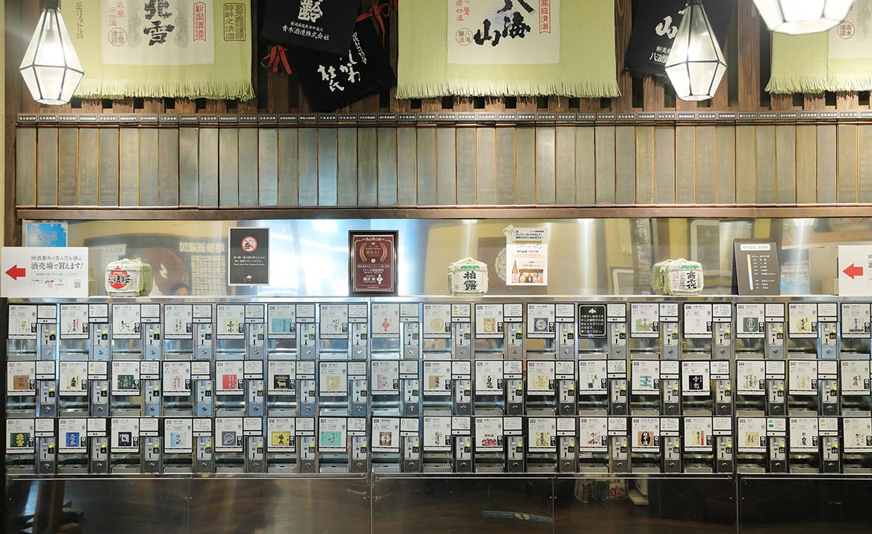 新潟人も知らない新潟を売る」との想いで30年前に越後湯沢駅に創業した「ぽんしゅ館」。新潟にある「ぽんしゅ館」内の唎酒番所の壁面を陣取る利き酒マシンには県内全酒蔵の111銘柄をそろえる。注ぎ口の横に手書きされている特徴や度数を見比べながら、清酒から純米大吟醸まで、さまざまなタイプの日本酒が試飲できる。店内には今月の推し蔵やランキングも掲示されているので参考に。