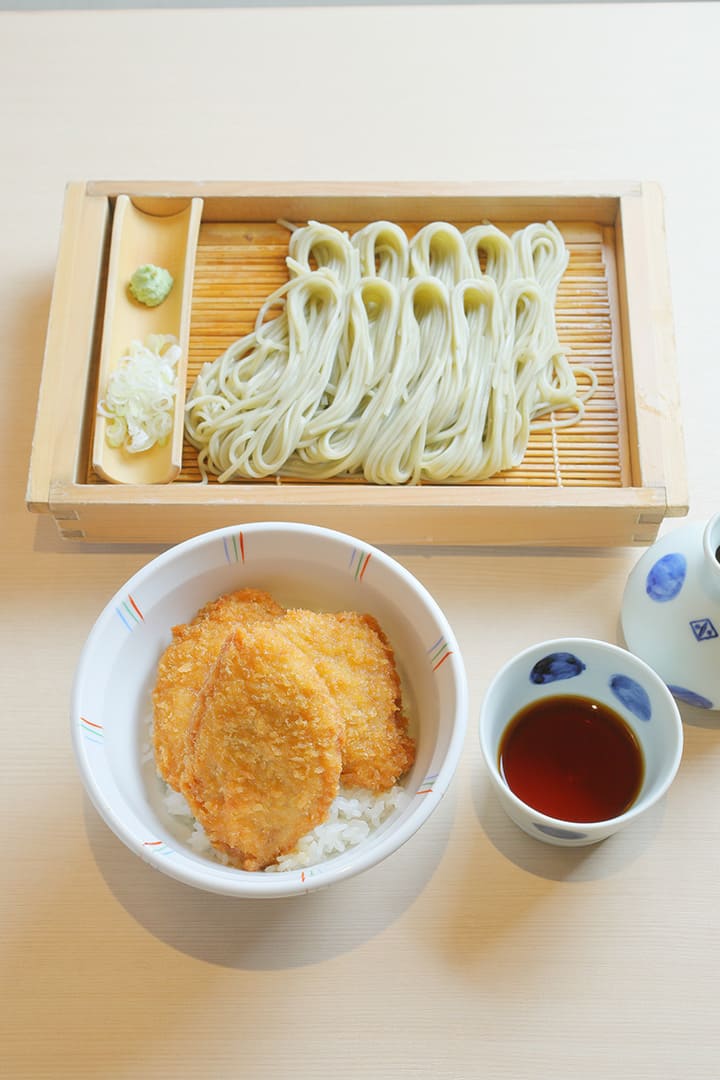 ひと口大に丸め、“へぎ”と呼ばれる木製の器に並べるへぎそばは、織物用ののりとして身近だったフノリをつなぎに使う郷土料理。石臼挽きのそば粉と青森県などで取れたフノリ、水だけで生地をこね、プリッとした歯ごたえが病みつきに。こちらでは、クリスピーなヒレカツと甘ダレが好相性の新潟市のご当地グルメ・タレかつ丼との夢のセットがお待ちかね。