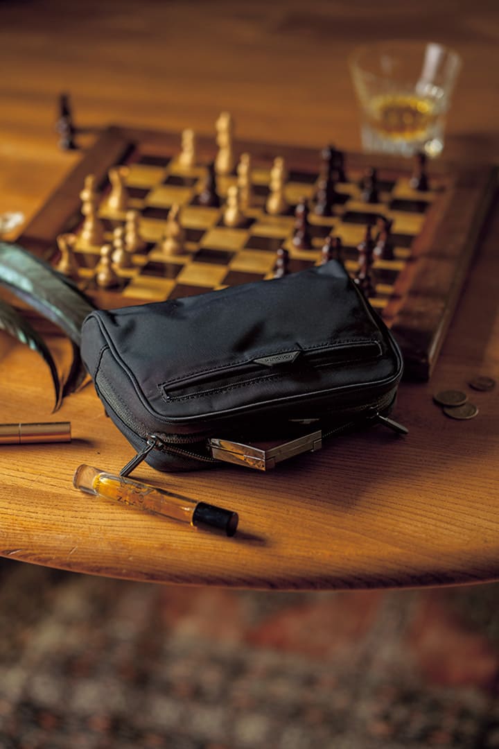 外側にはマグネット式ポケット、内側にはメッシュ地のオーガナイザーを備えた小物を整理しやすいマチ付きポーチ。開口部が広く、出し入れも楽ちん。MOBILE POUCH STANDARD BLACK 12,100円(モノリス)/6F MONOLITH(モノリス)