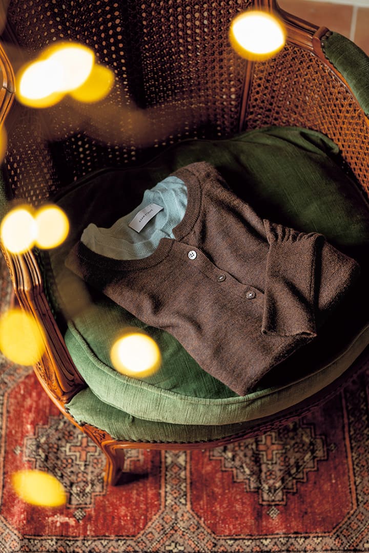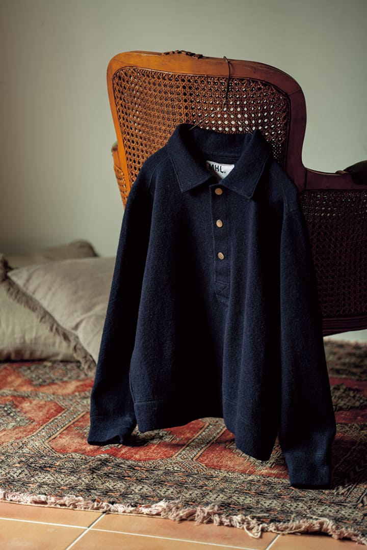 シェットランドウールと優しい肌触りのコットンを両立させた一着。前立てのボタンや襟付きのデザインが、何気ないアクセントに。WOOL COTTON RIB TOP KNIT 29,700円(エムエイチエル.)/4F MHL.(エムエイチエル)