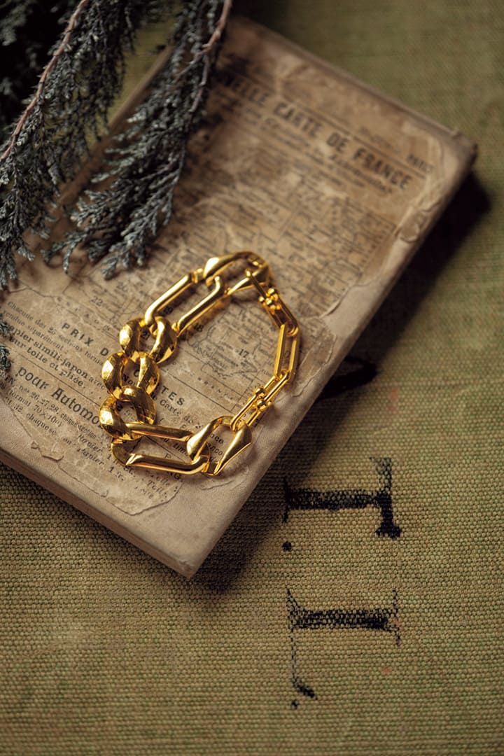 動くたびにさりげないきらめきを放つミラーカットチェーンを採用。大ぶりながら軽い着け心地で、コーディネートのポイントにぴったり。フィガロアンドミラーカットチェーンブレスレット 16,500円(イオ)/3F ADAM ET ROPÉ(アダム エ ロペ)