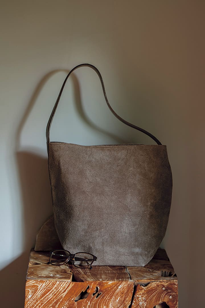 しなやかで上品な本革スエードが、トレンド感と洗練された印象をプラス。A4書類がすっきり収まるので、通勤シーンにも活躍する。ワンハンドルスウェード トートバッグ 22,000円(アーバンリサーチ)/3F URBAN RESEARCH(アーバンリサーチ)