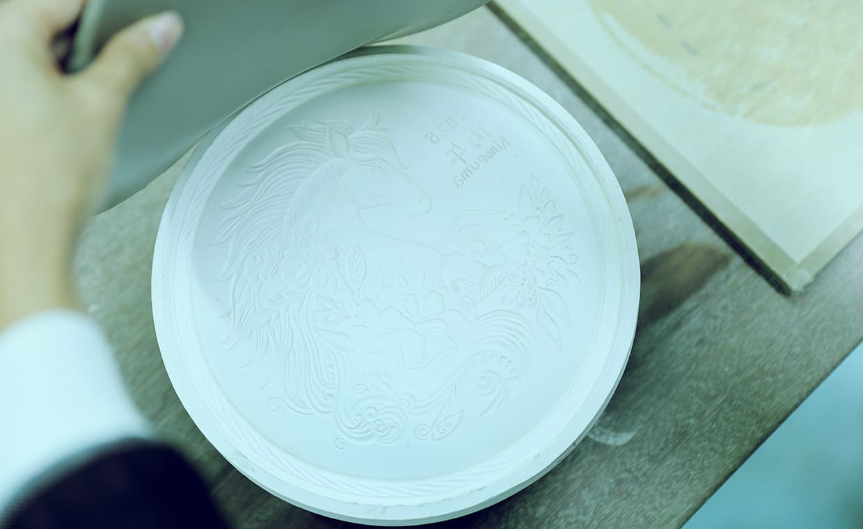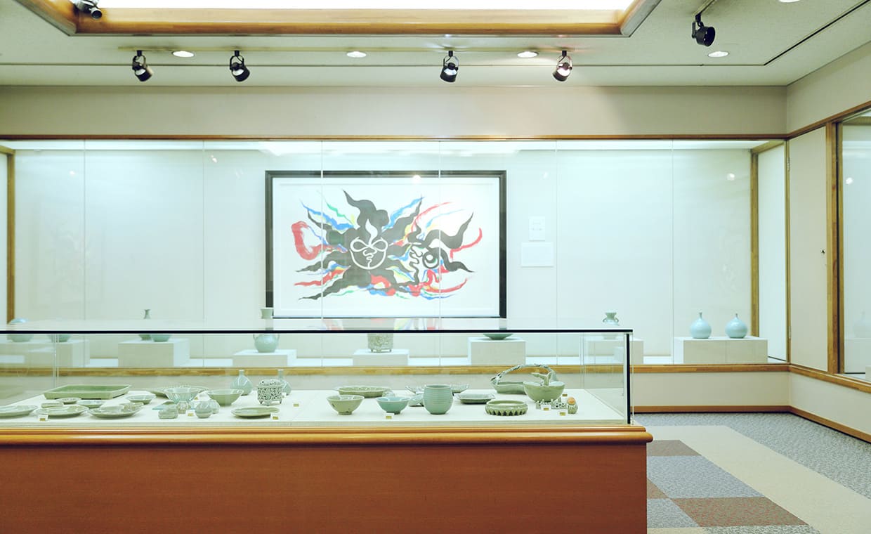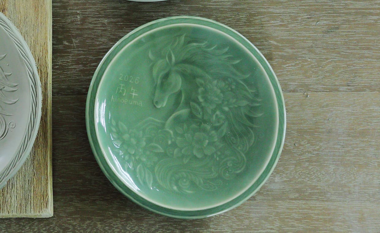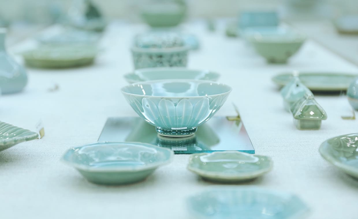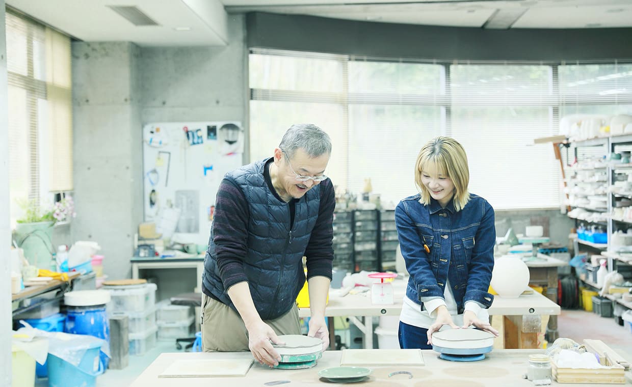 世界三大青磁の一つとされる三田青磁は、江戸時代後期から昭和初期にかけてこの地で生産されたものの下火に。透明感のある青緑色が特徴の三田青磁を再び広め、復興させようと尽力しているのが、館長で陶芸家の伊藤瑞宝さん(写真左)。絵付けや型押しなど青磁作り体験ができる陶芸教室や、展示室に飾られた作品を通して、さまざまな表情を持つ三田青磁の世界に触れることができる。
