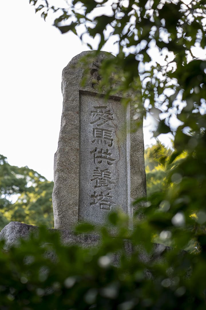 境内には競馬や乗馬の世界で活躍した馬のための供養塔も。体が大きな動物ゆえ、遺骨ではなくたてがみが納められている。