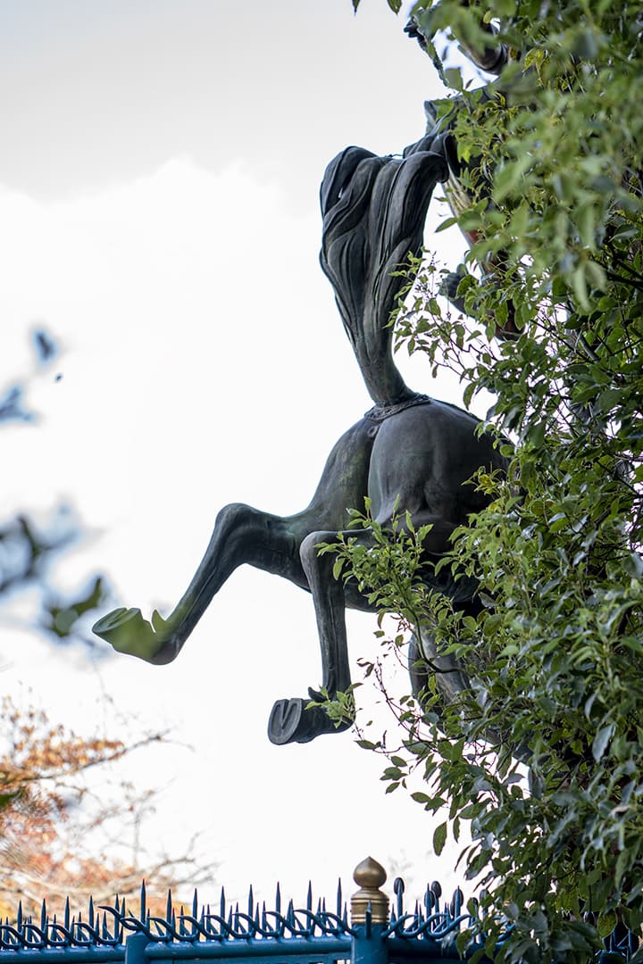 力強く躍動するお馬さんを背後から眺めてみると……はっと見とれるほどの美尻がひょっこり。リアルな造形は鋳物の名匠、大谷相模掾隆義によるもの。