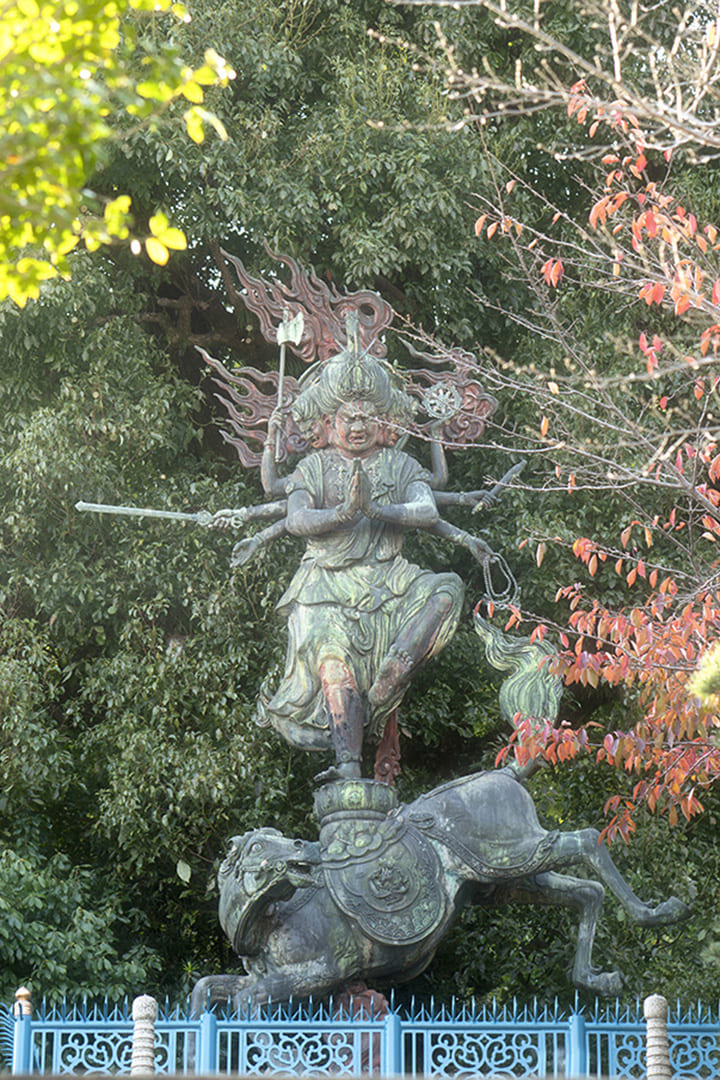 六甲の霊峰・摩耶山へ続く登山口にある[妙光院]。703年、天武天皇の勅願により建立された地は京都の京極。その後、後陽成天皇の勅願で山科に再興されるも、第24世圓照和尚が未来の発展を見据え、この地へ移したのが約120年前のこと。先見の明がある和尚らしく、1933年に動物愛護の精神を普及すべく造立したのが馬頭観世音菩薩(ばとうかんぜおんぼさつ)。以来、競馬や乗馬関係者から崇敬を集めるだけでなく、かの高松宮杯を生んだ高松宮宣仁親王も御台臨されたという、全国屈指の馬に縁ある名刹となった。霊峰を背にそびえる馬頭観音は像高6mほど。血湧き肉踊る馬の背に憤怒の表情で立つその御姿は、威風堂々! 境内の清涼な空気も相まって、思わず背筋が伸びる。