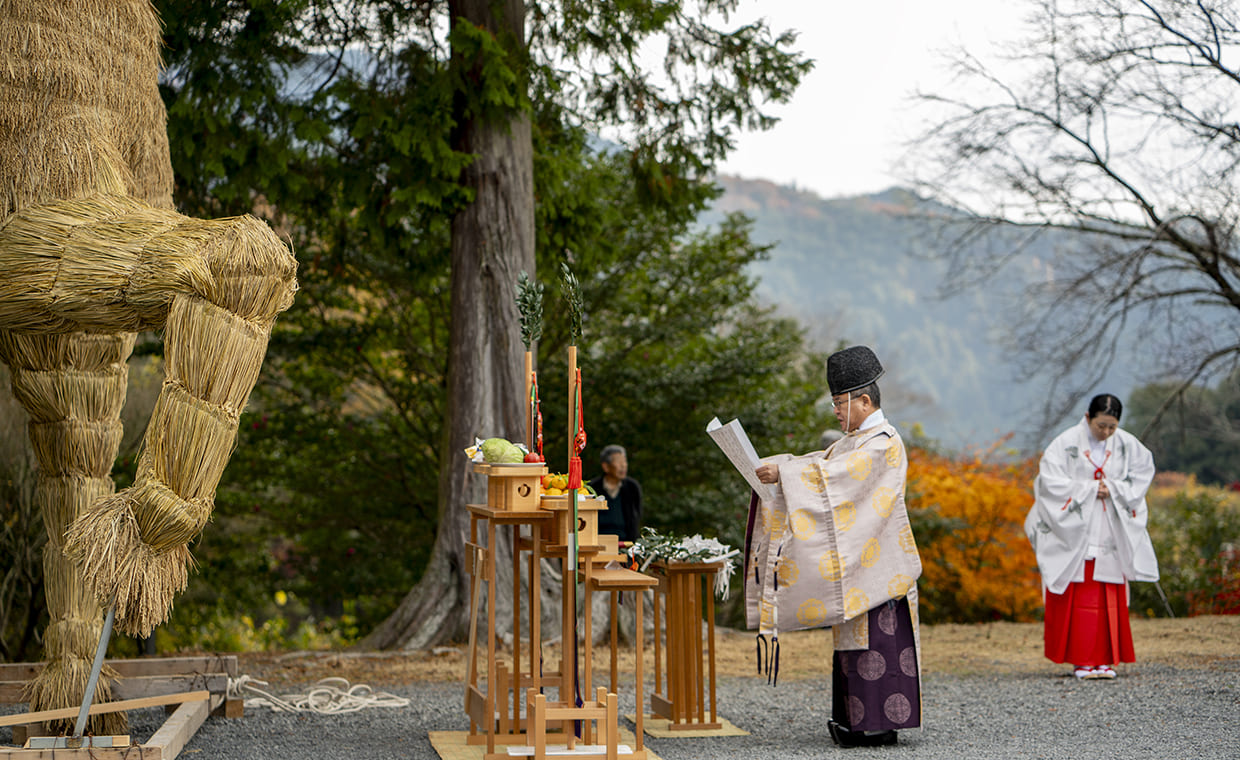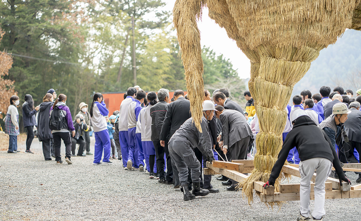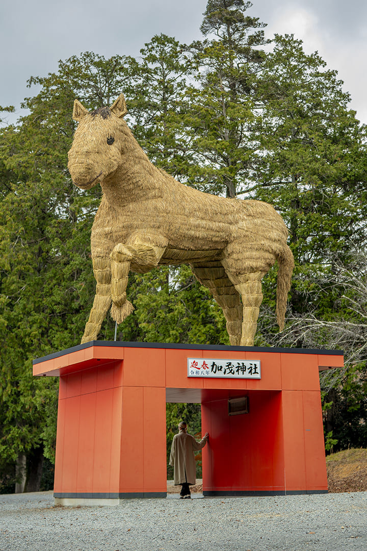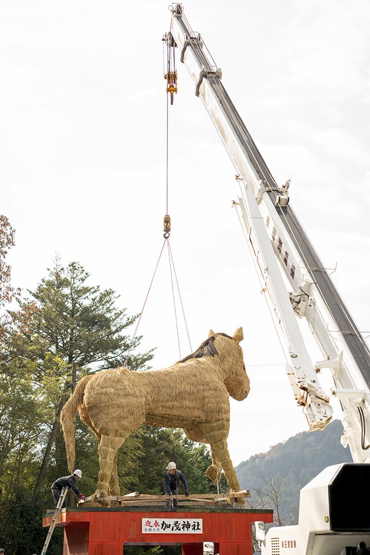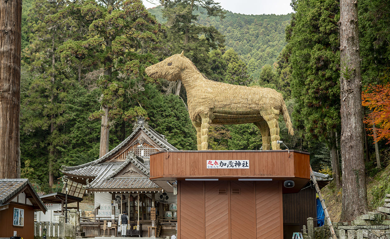 かつて京都[上賀茂神社(賀茂別雷神社)]の荘園だった「安志庄(あんじのしょう)」と呼ばれた安富地域に、その分霊である別雷神を祭り建立された[安志加茂神社]。地域の守り神として住民に親しまれ、普段は穏やかな空気が流れる境内だが、毎年年末になると巨大な干支飾りが登場しにぎにぎしい雰囲気に。「かつて干支にちなんだものを奉納しようという声が上がり、『せっかくなら大きいものを』と、1977年から住人が協力して育てた稲穂で作った巨大な干支が奉納されるようになったんです」と宮司の真田慶樹さん。今年は12月1日の「干支引き行事」で、高さ5m、重さ2tにおよぶ馬の飾りが地元住民や子ども達によって奉納された。左前足を上げた躍動的な姿が、飛躍の一年を予感させる!